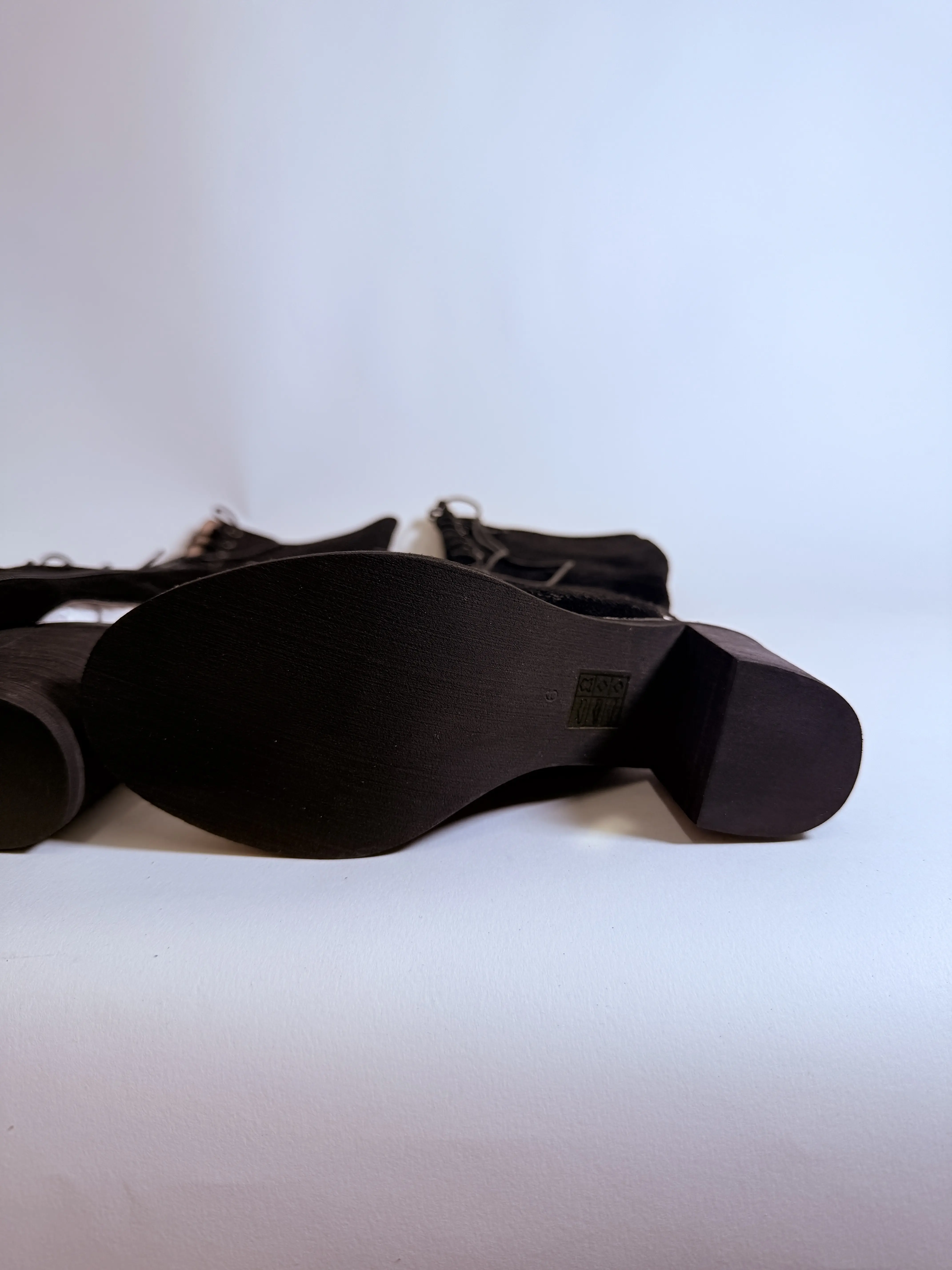 Elevate your style with the Jeffrey Campbell Countess Boots, a striking fusion of vintage allure and modern design. Crafted from black distressed suede, these knee-high boots feature a peep-toe and lace-up front, exuding both elegance and edge. Authentic leather.