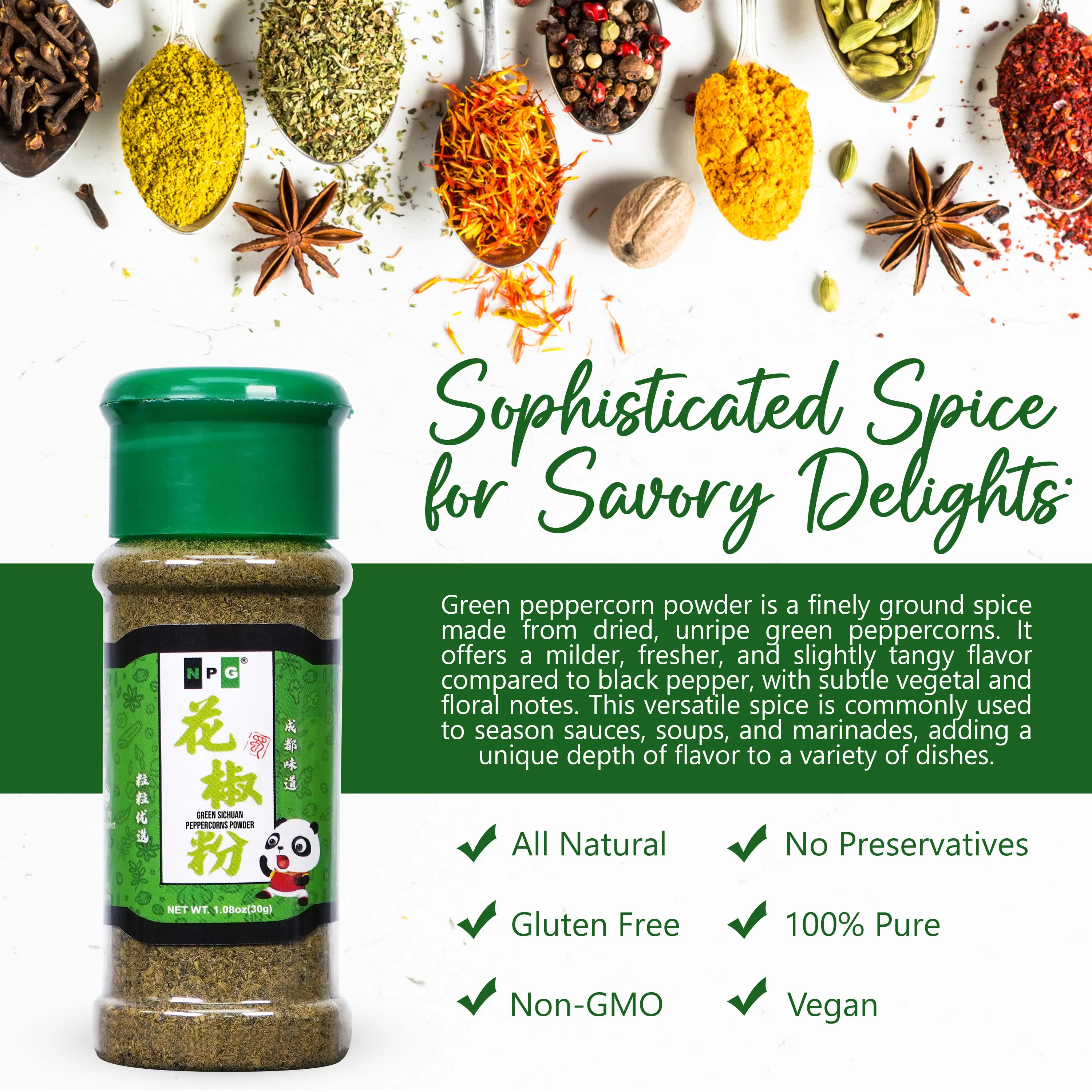 Experience the tongue-tingling and mouth-numbing sensation with NPG Premium Szechuan Green Peppercorns Powder 1.08, a must-have herb in your kitchen for preparing authentic Chinese dishes.