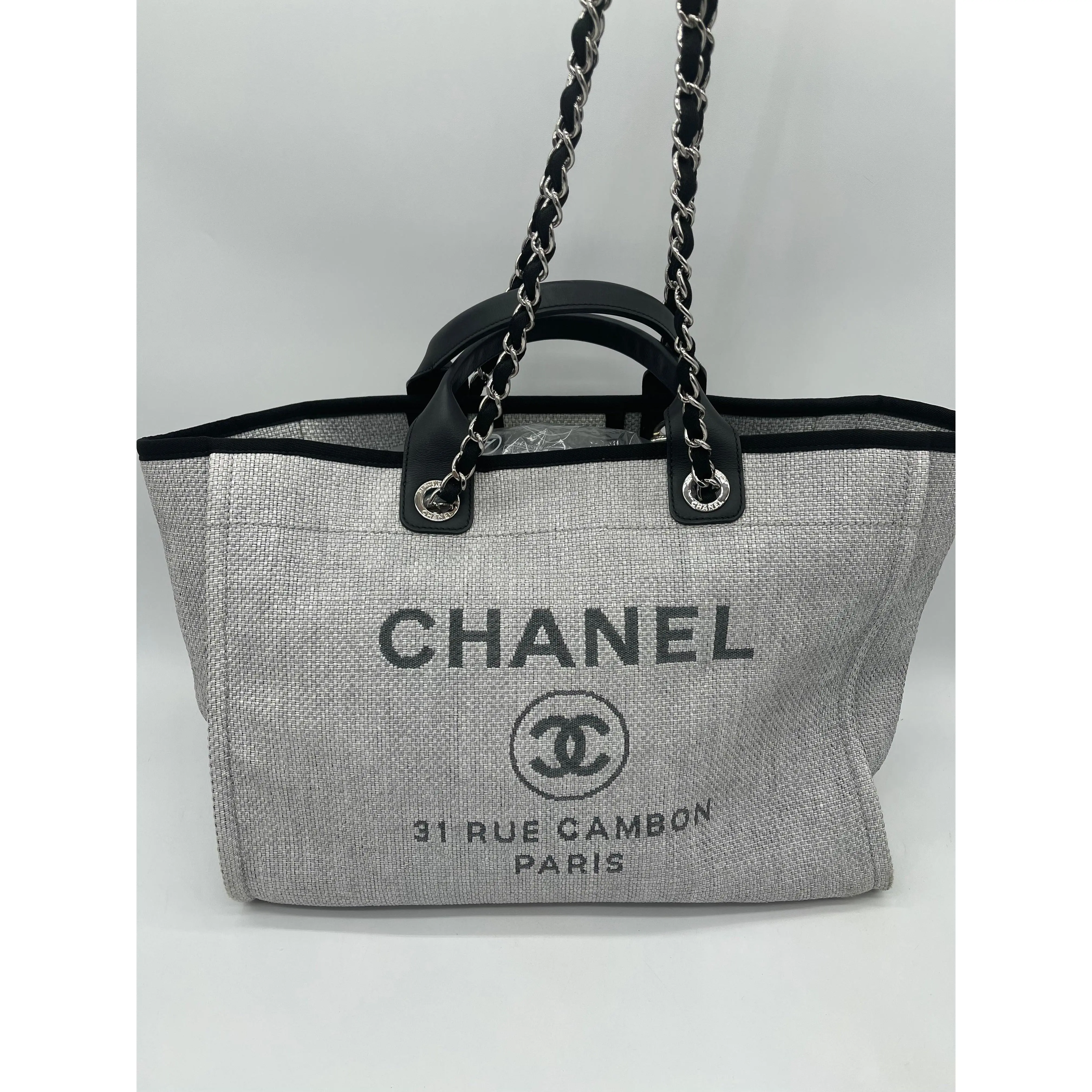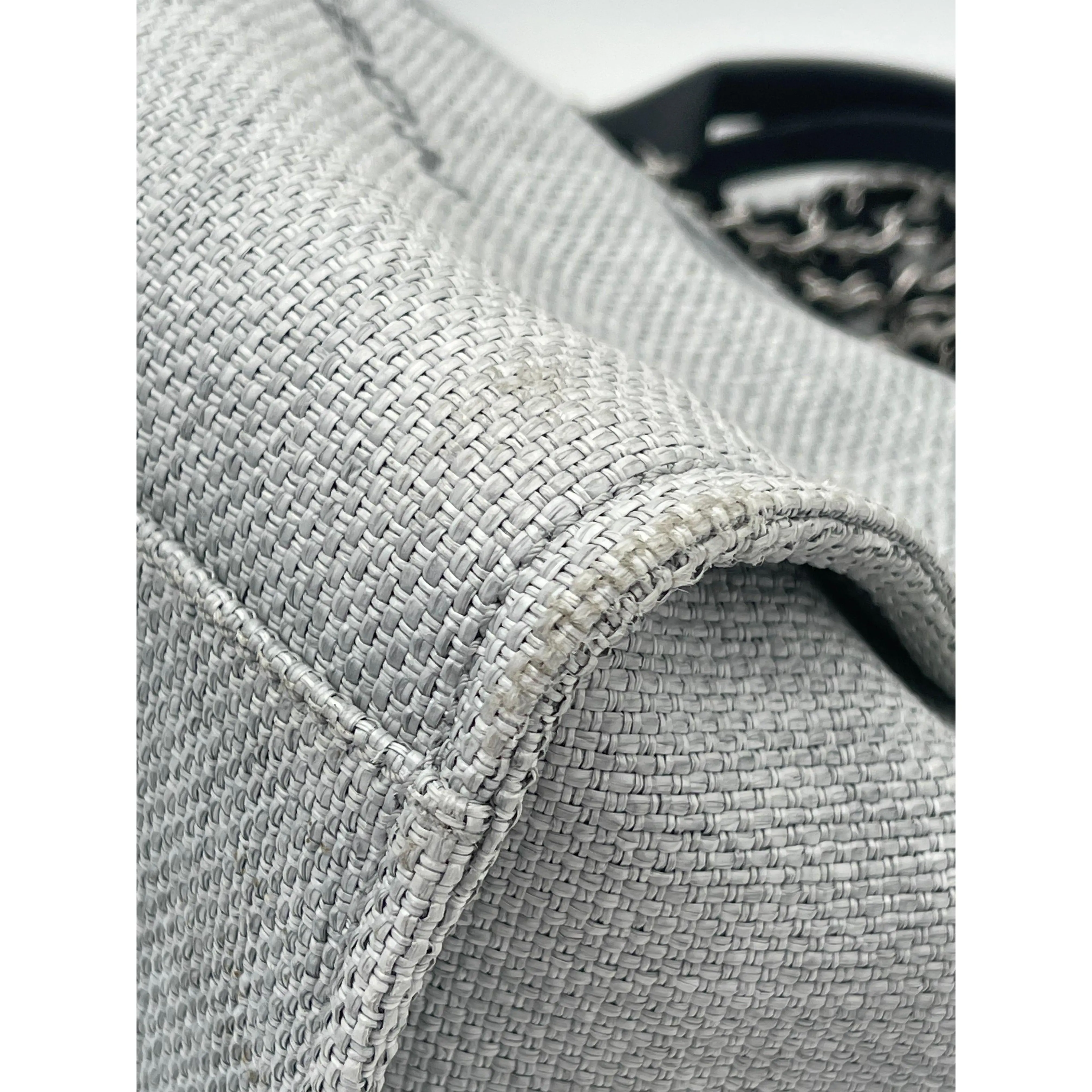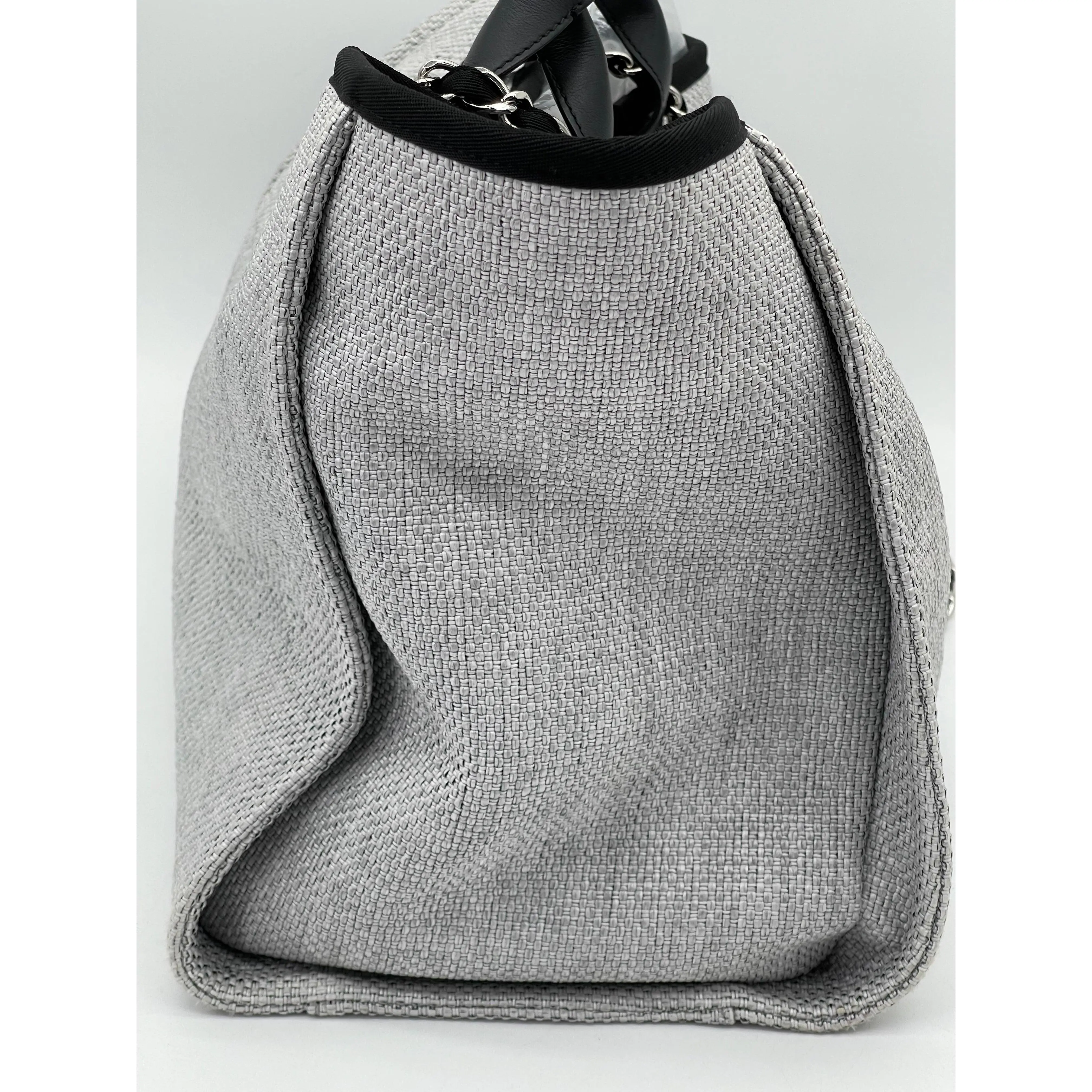 Preloved Chanel Gray Raffia Leather Deauville L Tote (Large)Measurements: 15"W x 11.5"H x 7.75"DStrap Drop: 11.5"Handle drop: 4"Code: 22076635 Year: 2016ENTRUPY: 3JHCX79Preloved - Gently Used - Exterior: Light wear, few marks on the botton and corners.Interior is clean. See photos. Entrupy letter of Authenticity! Free Shipping, Insurance, & Signature Confirmation USA!* ALL sales are final, no refunds, no exchanges - all items are PRELOVED and/ or VINTAGE condition. The color in the photo may be different than the actual item due to the lighting and/or filter settings. Preloved items may have odor from storage or use. Please look at photos and read item description before purchase. *KimmieBBags LLC is not affiliated with Chanel resold on this site. All bags are on consignment, pre-loved and are in used and/or vintage condition. All bags, wallets, and agendas are guaranteed Authentic by a third party Entrupy. A certificate will accompany each item purchased to verify authenticity.