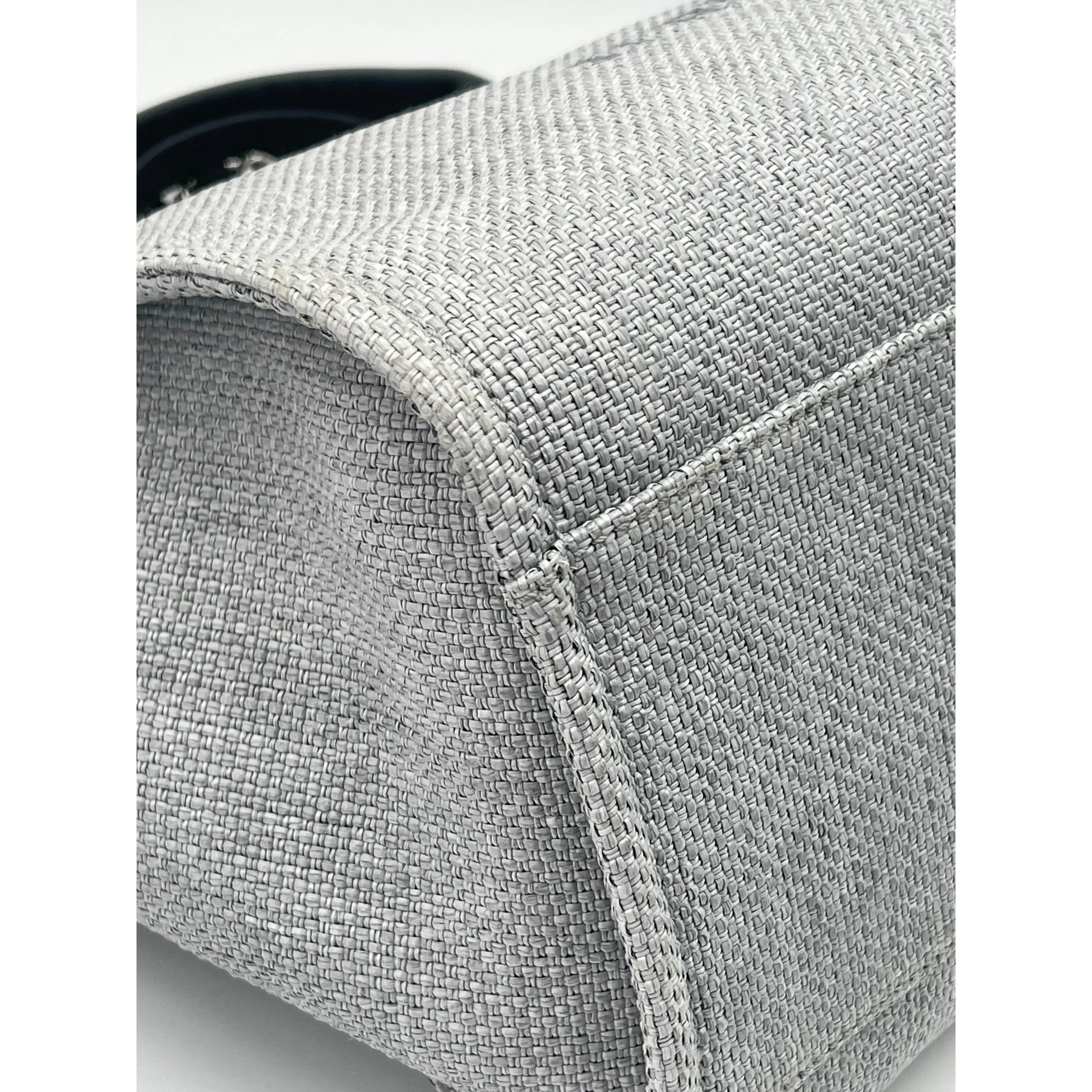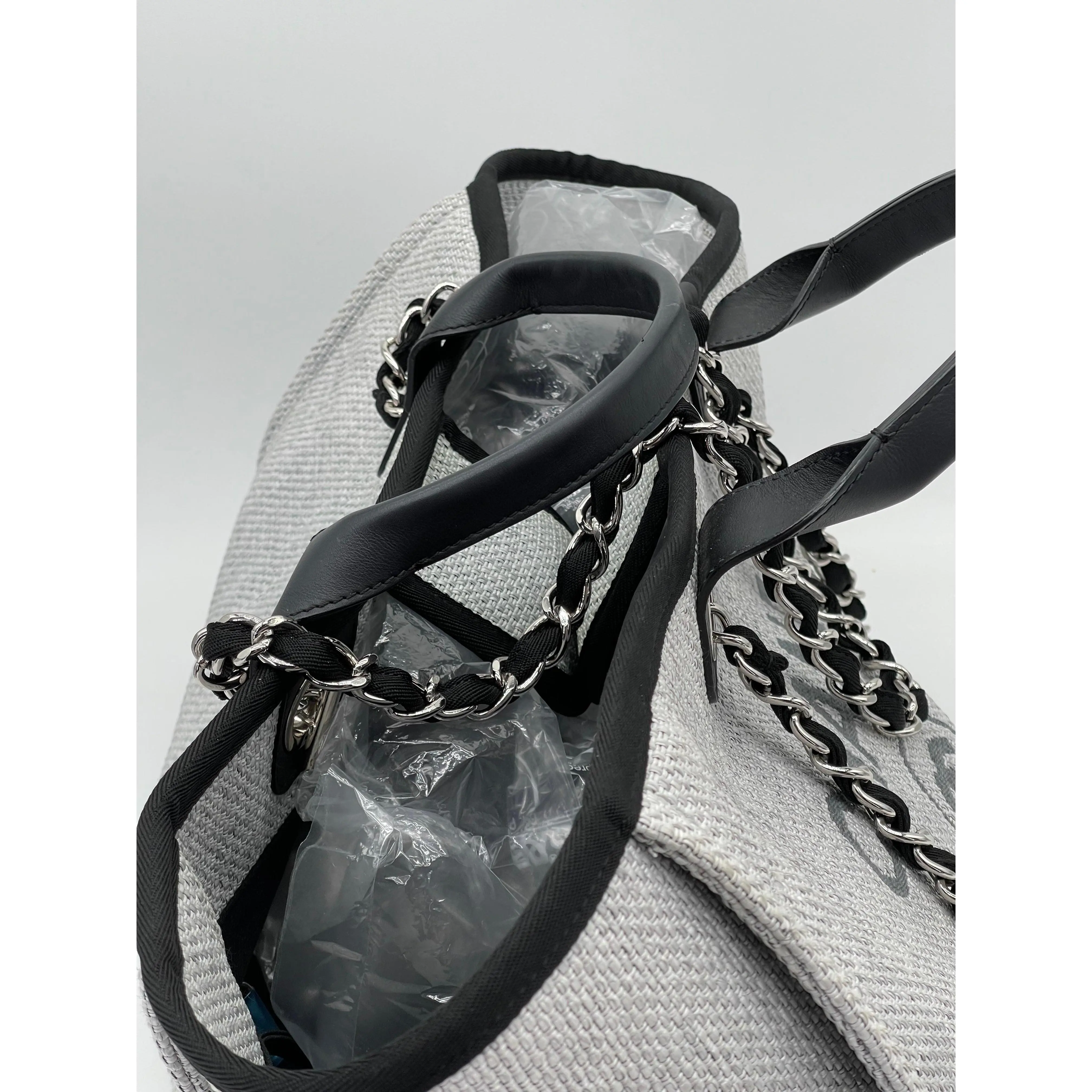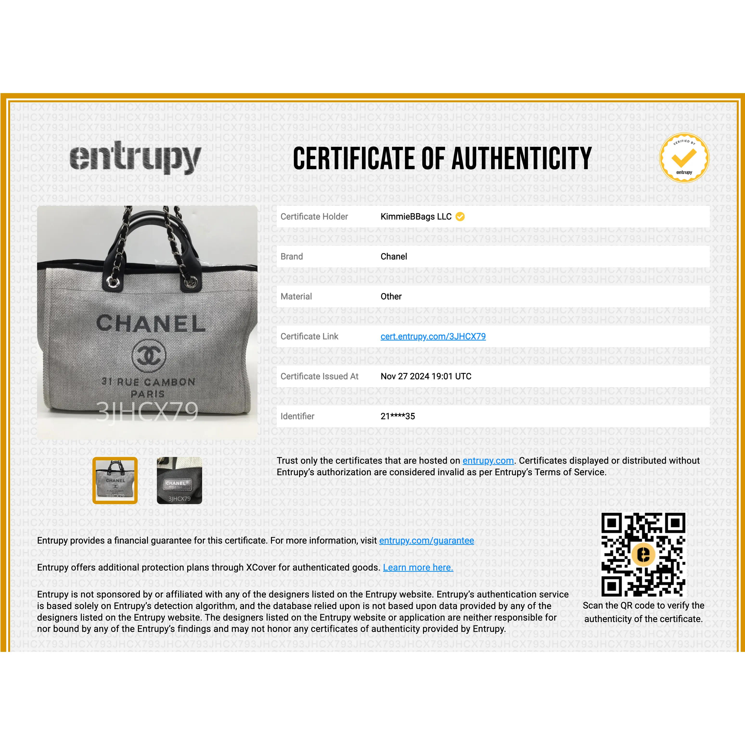 Preloved Chanel Gray Raffia Leather Deauville L Tote (Large)Measurements: 15"W x 11.5"H x 7.75"DStrap Drop: 11.5"Handle drop: 4"Code: 22076635 Year: 2016ENTRUPY: 3JHCX79Preloved - Gently Used - Exterior: Light wear, few marks on the botton and corners.Interior is clean. See photos. Entrupy letter of Authenticity! Free Shipping, Insurance, & Signature Confirmation USA!* ALL sales are final, no refunds, no exchanges - all items are PRELOVED and/ or VINTAGE condition. The color in the photo may be different than the actual item due to the lighting and/or filter settings. Preloved items may have odor from storage or use. Please look at photos and read item description before purchase. *KimmieBBags LLC is not affiliated with Chanel resold on this site. All bags are on consignment, pre-loved and are in used and/or vintage condition. All bags, wallets, and agendas are guaranteed Authentic by a third party Entrupy. A certificate will accompany each item purchased to verify authenticity.