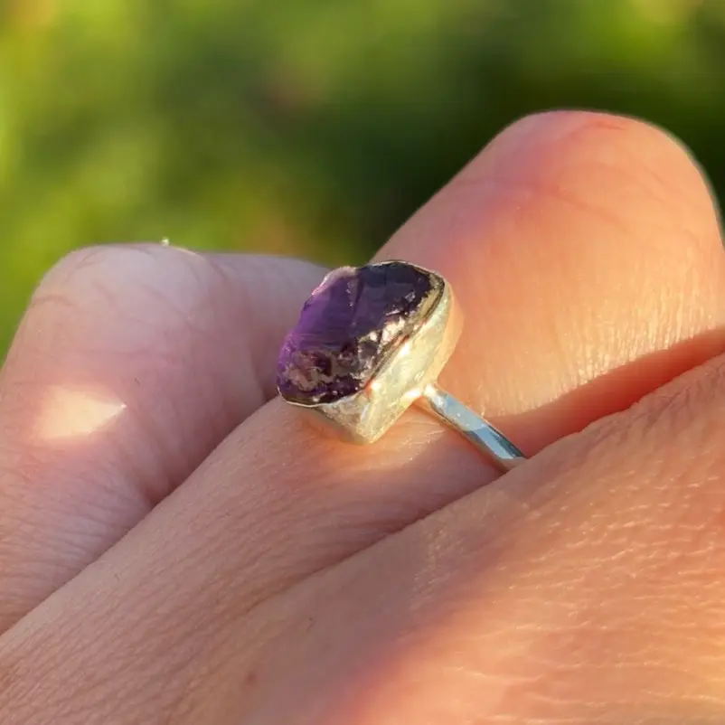 Overall, this sterling silver ring with a natural rough amethyst stone is a beautiful and unique piece of jewelry that is sure to impress. The use of sterling silver ensures that the ring is durable and long-lasting, while the natural rough amethyst stone adds a unique and natural element to the ring. With each ring being one-of-a-kind, this ring is sure to be a cherished addition to any jewelry collection.