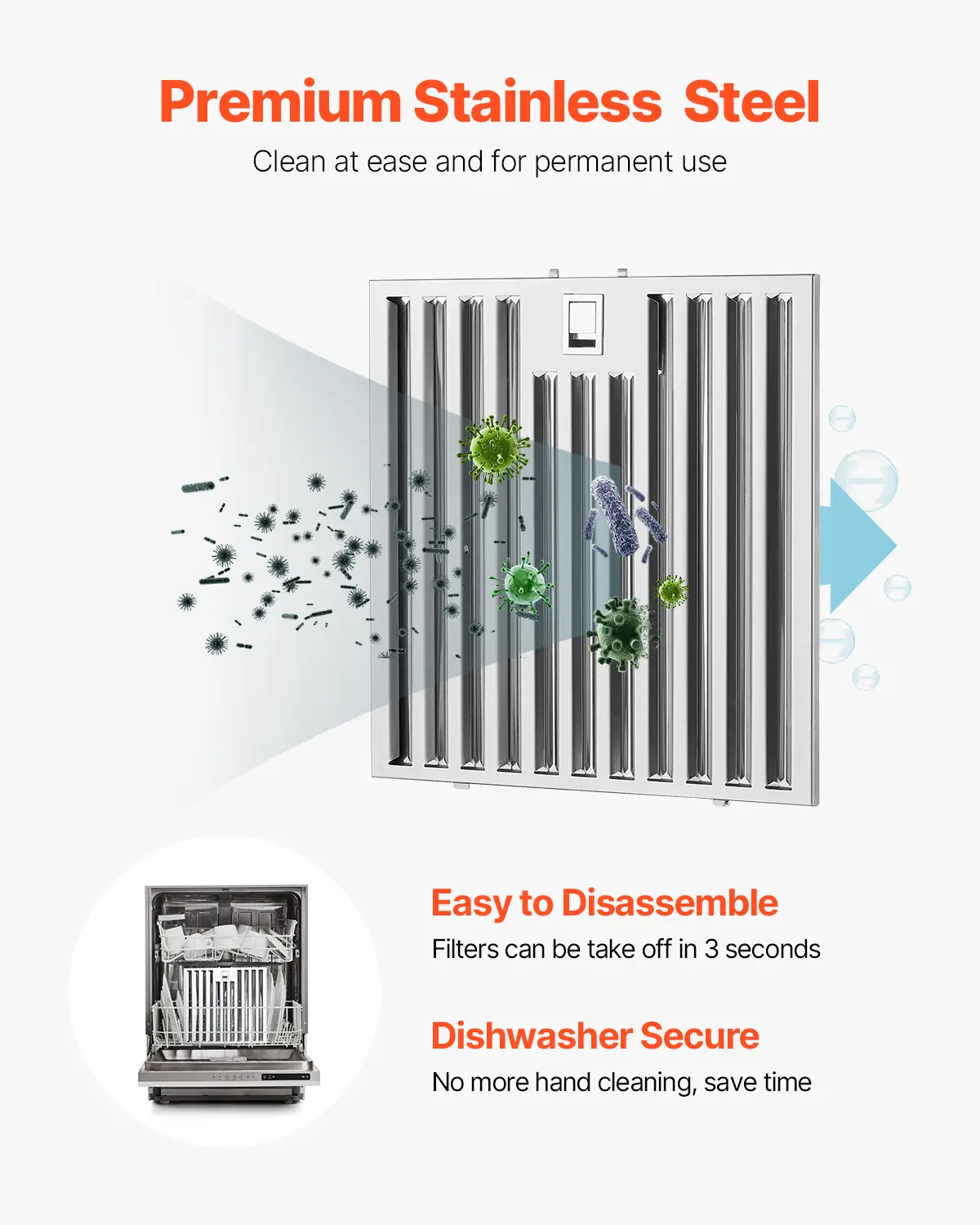 • Premium Stainless Steel: Crafted for durability and ease of maintenance, the vent hood features stainless steel. Its 2 detachable filters effectively capture grease and oil, and are dishwasher safe, making cleanup a breeze.