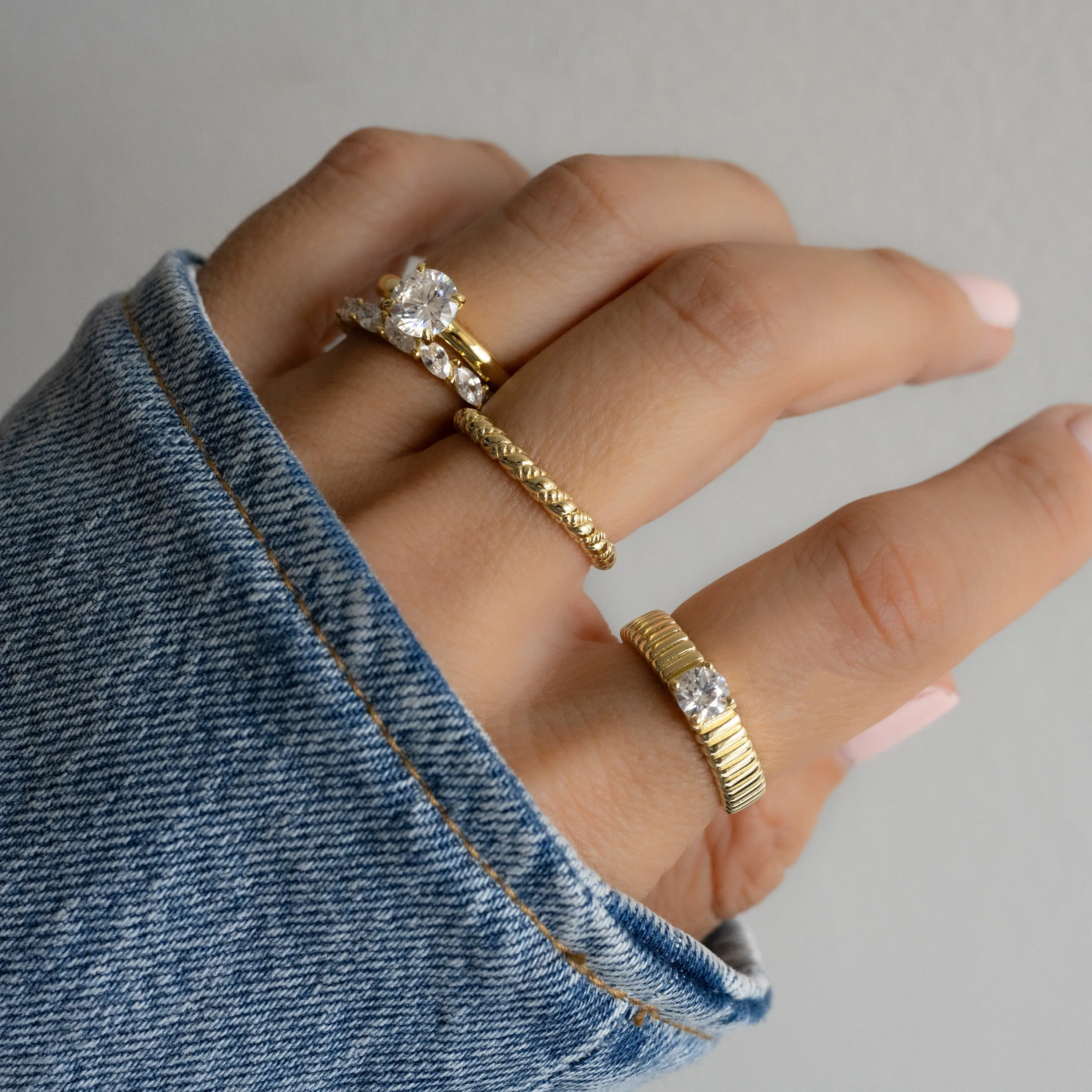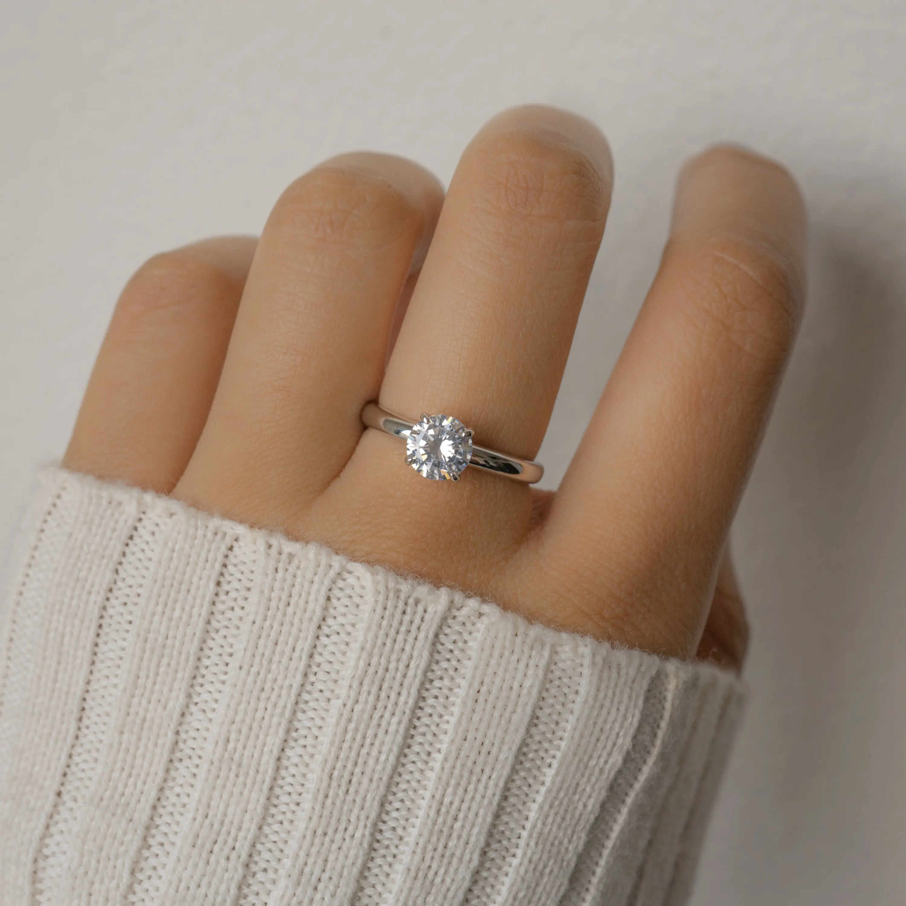 Engagement-style ring featuring a round solitaire cubic zirconia stone, perfect as a classic placeholder for your engagement ring! Timeless, elegant, and easy to wear every day.