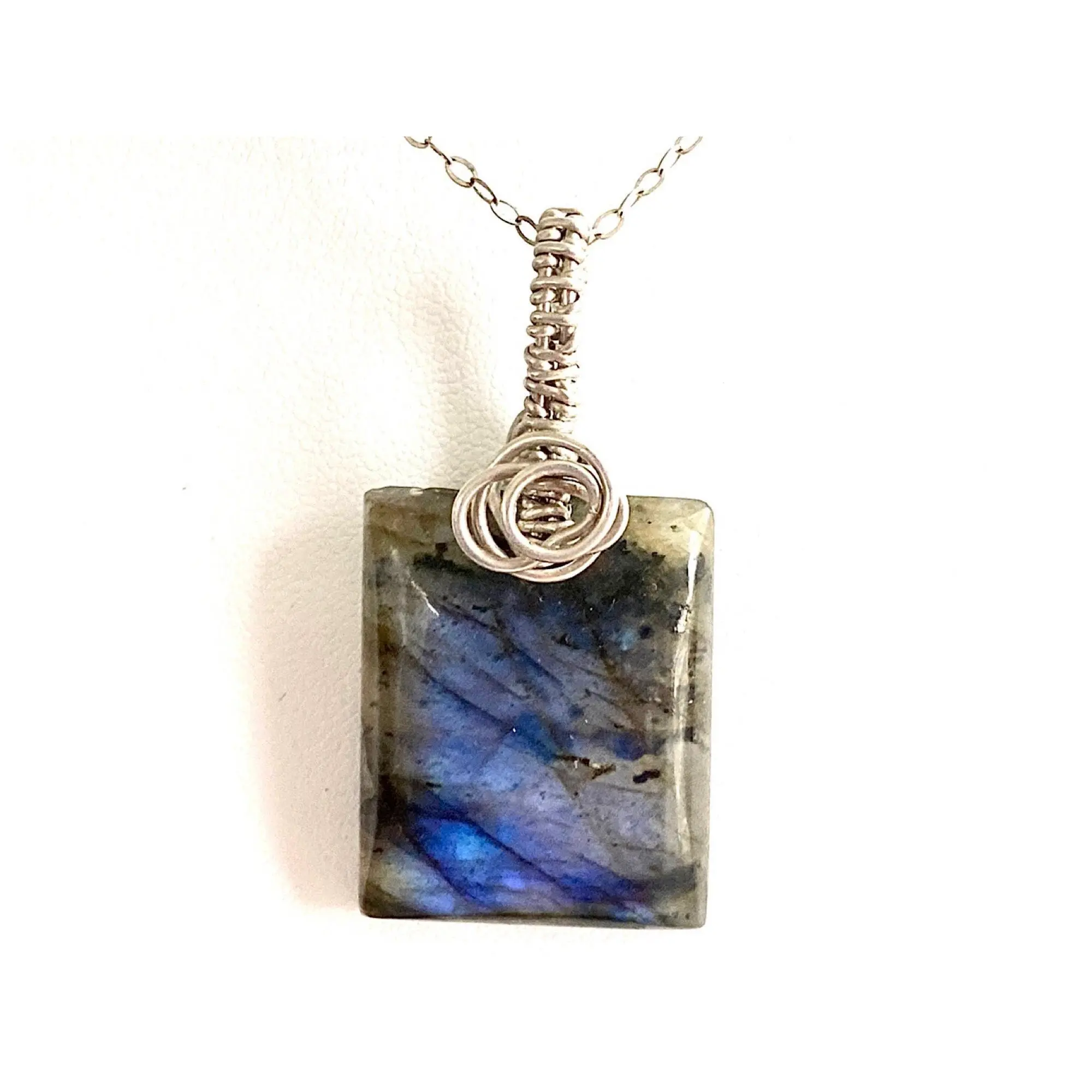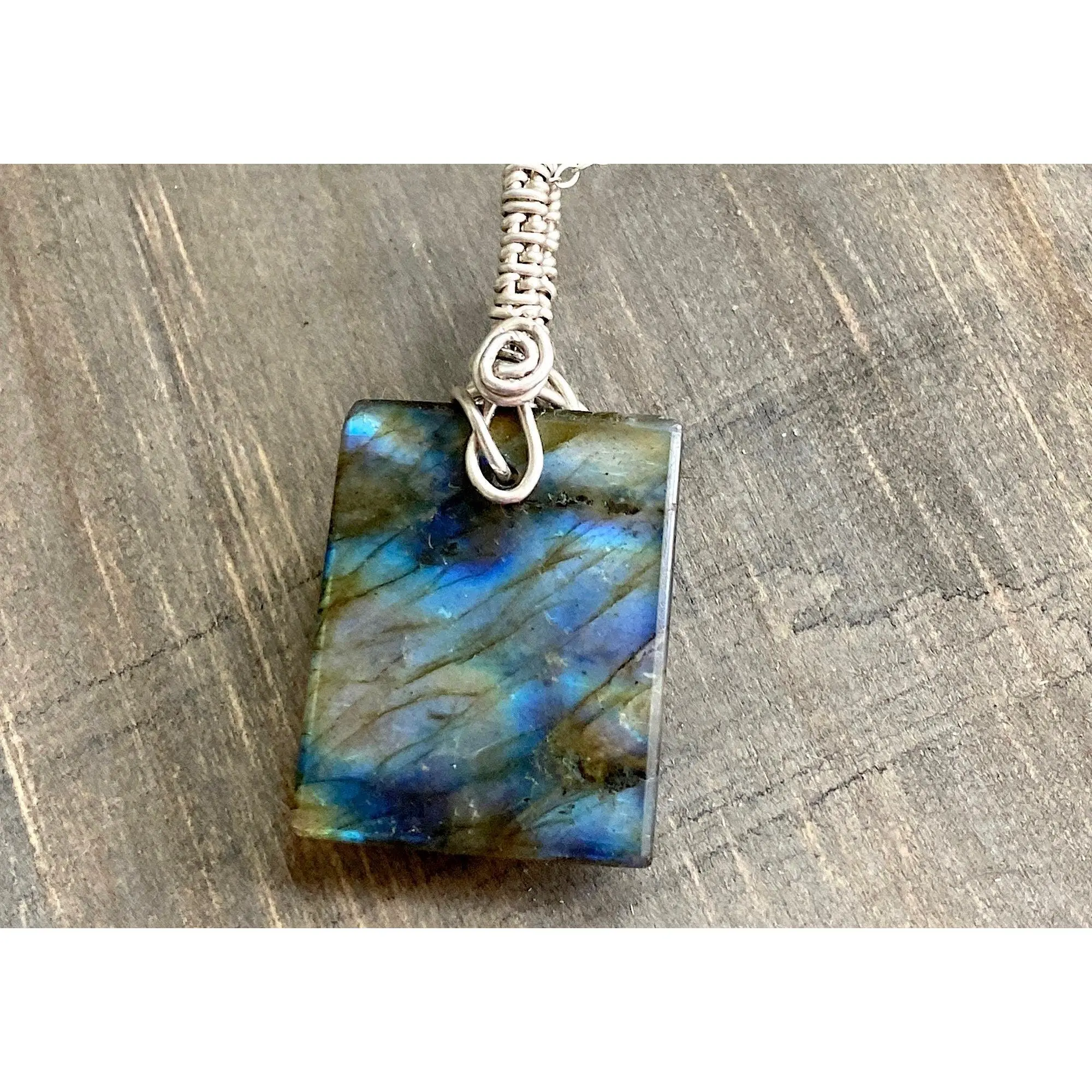 Amazing Blue Flash Rectangle Labradorite and .925 Sterling Silver Necklace, Deep Blue Handpolished Wire Wrapped Pendant, Handmade in the USA