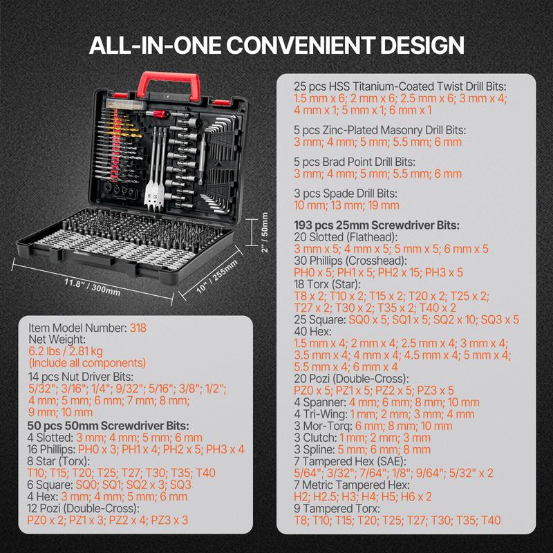 VEVOR Drill Bit Set, 318 Pieces Drill and Driver Bit Set, Screwdriver Bit Set Suitable for Wood Metal Cement Drilling and Screw Driving, Drill Bit Sets Combo Kit Assorted in Organized Carrying Case