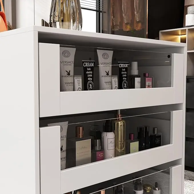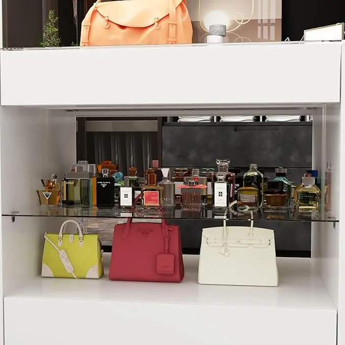 ¡Sufficient Storage - The makeup island desk features 2 drawers underneath the glass tabletop, 4 side drawers with glass fronts, 2 tier open shelves and 2 bottom drawer. Youâll have plenty of storage to sort out your perfumes, nail polish, towels, scarves, cosmetic bags and so on.