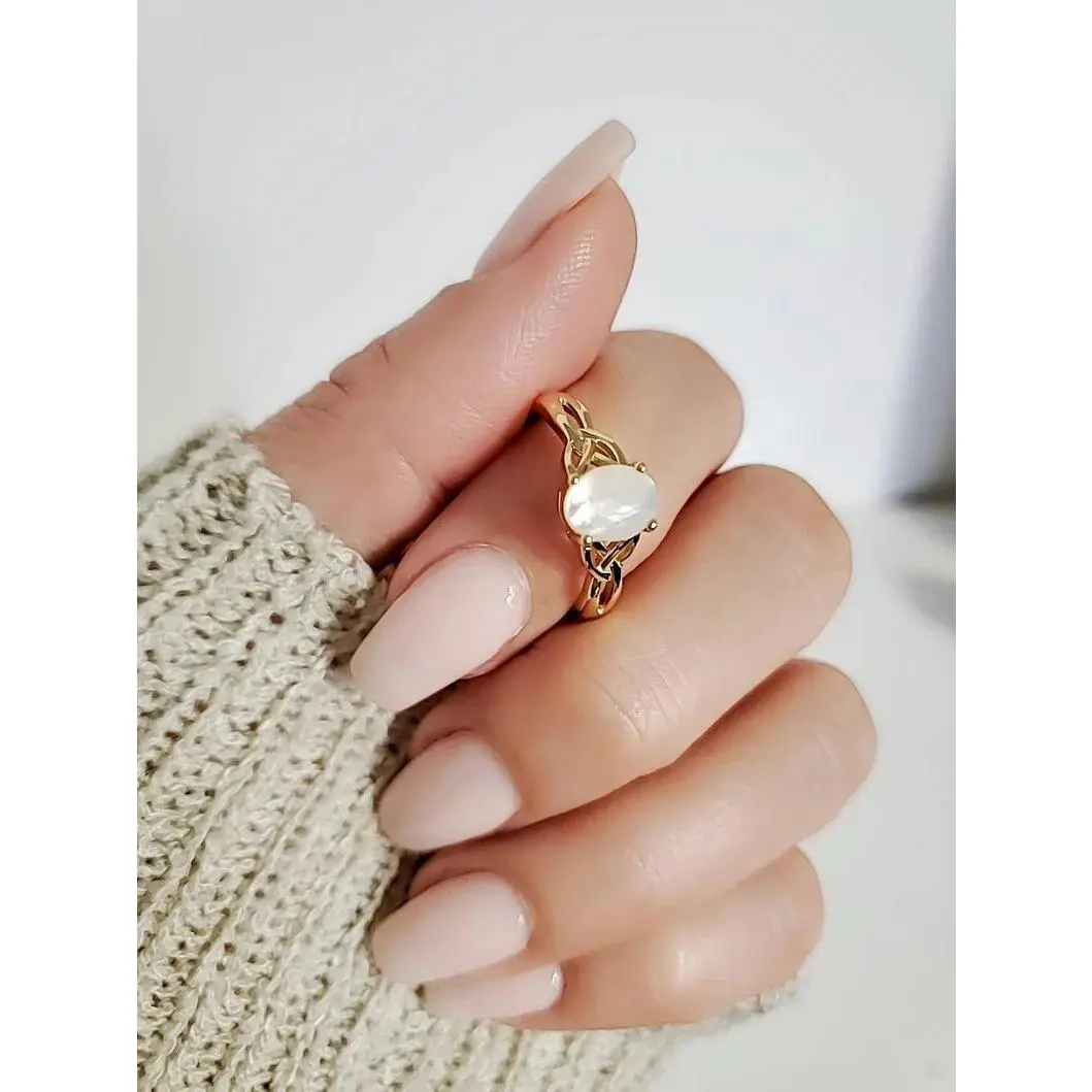 Discover the elegance of our Mother of Pearl Gold Celtic Ring, a stunning piece of jewelry that embodies the timeless beauty of Celtic design. This ring is perfect for those who appreciate a blend of traditional and modern aesthetics. Crafted from high-quality mother of pearl, known for its luxurious appearance and unique texture.