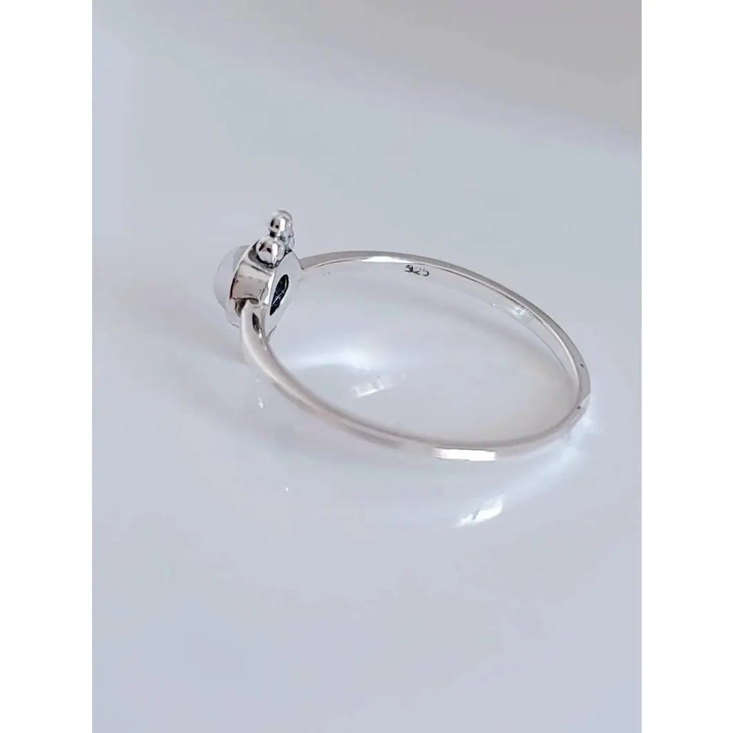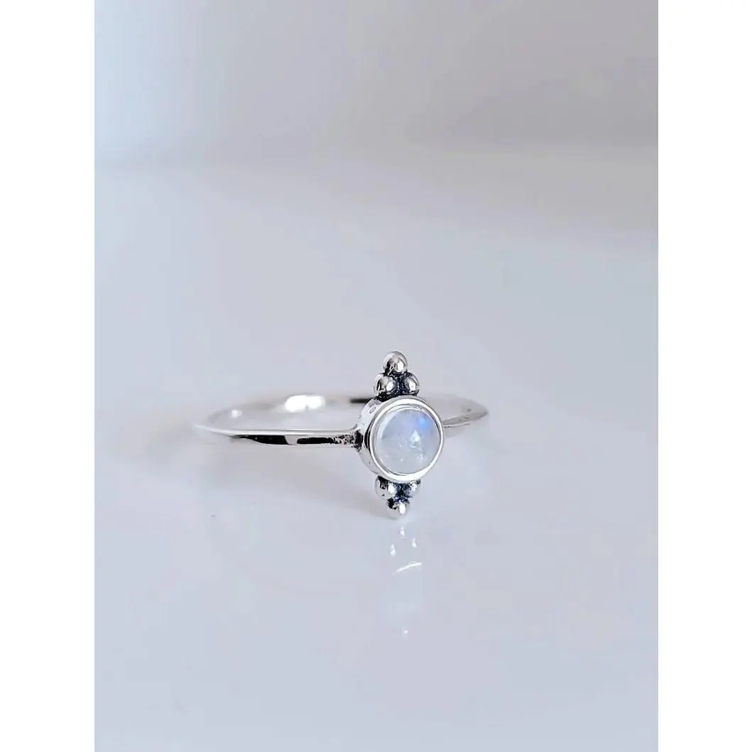 This delicate sterling silver ring features a genuine rainbow moonstone, celebrated as a stone for "new beginnings." Known for its serene energies, moonstone is thought to inspire balance, inner growth, and protection, while enhancing creativity and intuition. The ring’s beaded solitaire design, crafted with a high-polish and oxidized finish, adds a bohemian elegance that’s perfect for stacking or wearing alone. Each moonstone is unique, with natural variations in color that make every ring one-of-a-kind.