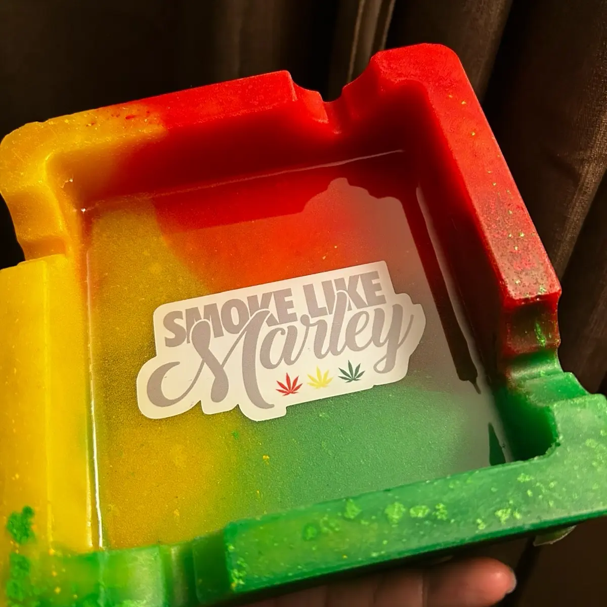 Rasta inspired ashtray with the quote “Smoke like Marley” in the center. The colors are red, yellow, green. Can hold cigar, rolls, smudge stick, etc.