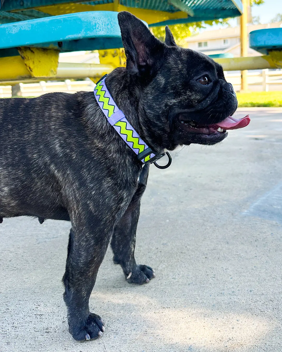 Designed in our Waggy Waves print with a lavender purple base and bold neon green zigzag details, this everyday dog collar adds a playful pop of color to any walk. Made with durable padded materials for added comfort, it’s designed for secure, comfortable, everyday wear.