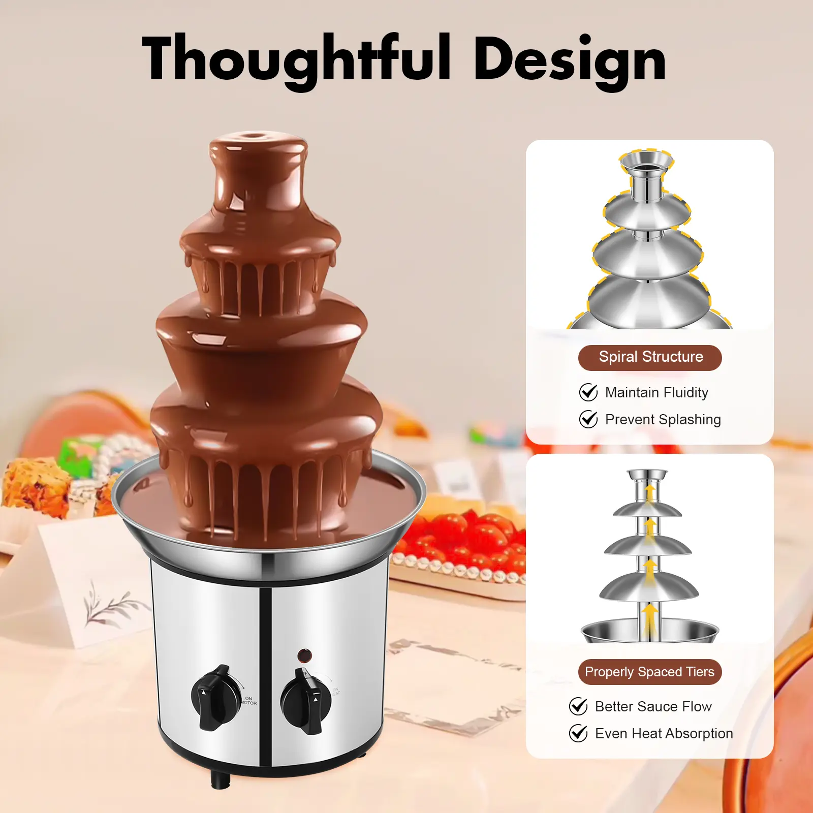 Large Capacity: It has a 4-tier that can hold up to 60.86oz chocolate sauce, which can meet the needs of family and friends gatherings.