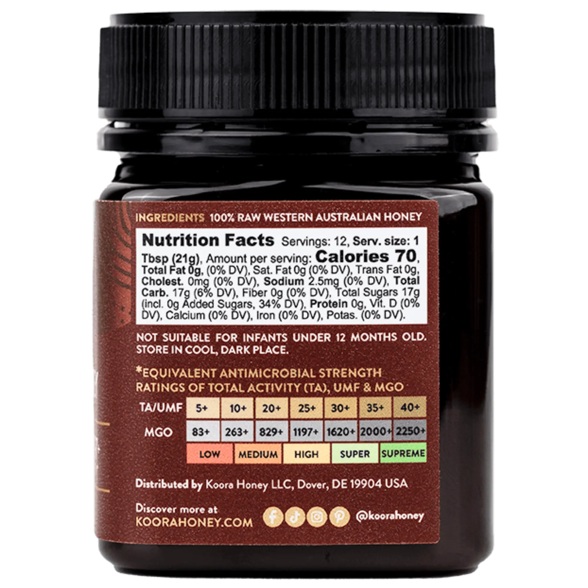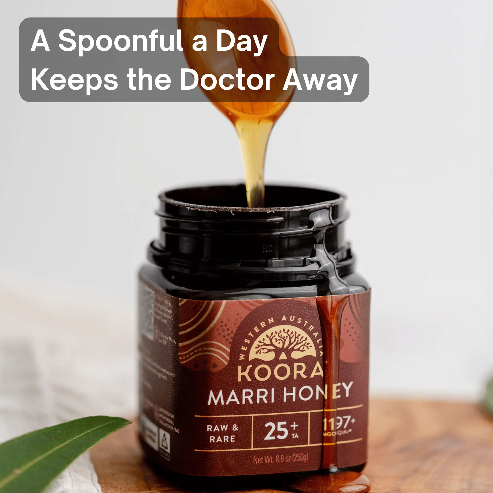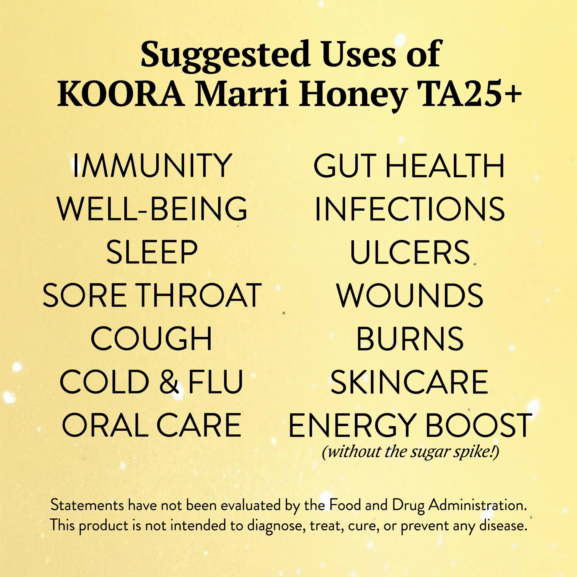 ·Natural Immunity Booster: Enjoy 1-2 teaspoons daily to boost your natural immunity. KOORA Marri honey's antimicrobial rating is TA25+ (lab certified by third party labs which test Manuka) equivalent to UMF25+ or MGO1197+, which surpasses most honeys in the world including Manuka.