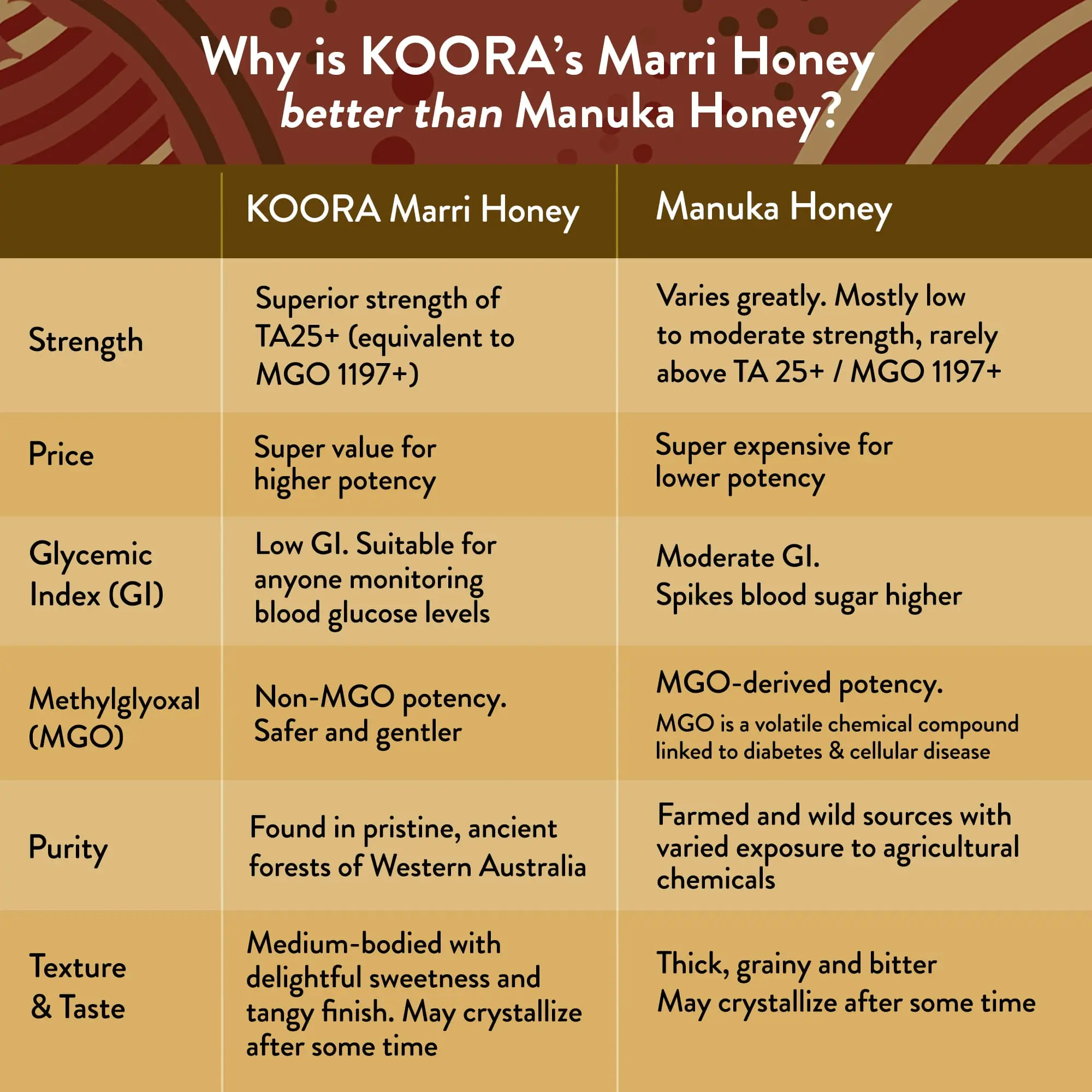 ·Unmatched Value: KOORA Marri honey has powerful potency from its incredibly strong antimicrobial properties and high antioxidant levels, that are not derived from potentially harmful MGO. And you get to enjoy it at a better price point than other comparable medicinal honeys, making it a clear winner at unbeatable value.
