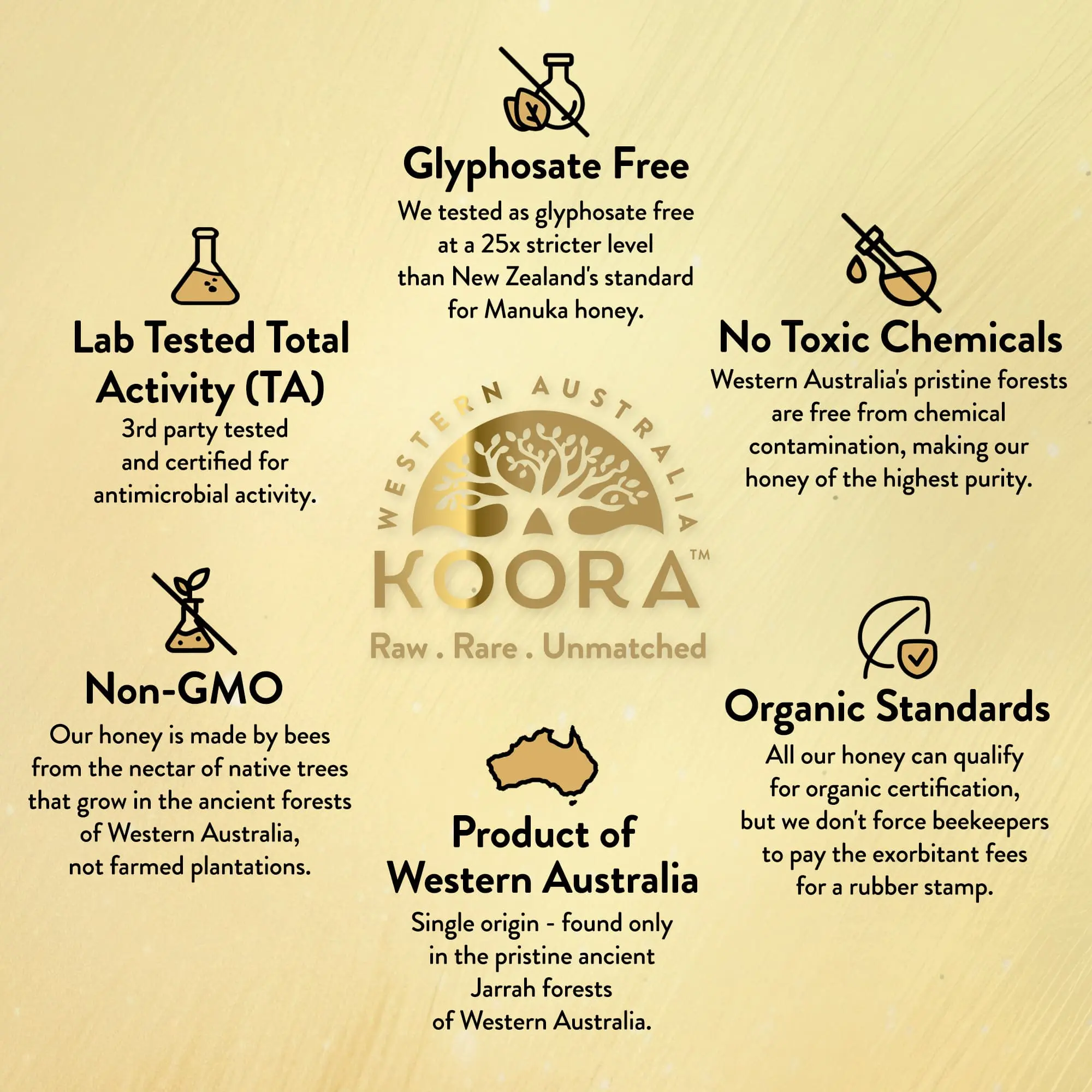 All KOORA honey is raw and pure, sustainably sourced from the pristine ancient forests of Western Australia, free from agricultural contamination and pollution, tested to be free from Glyphosate residue.