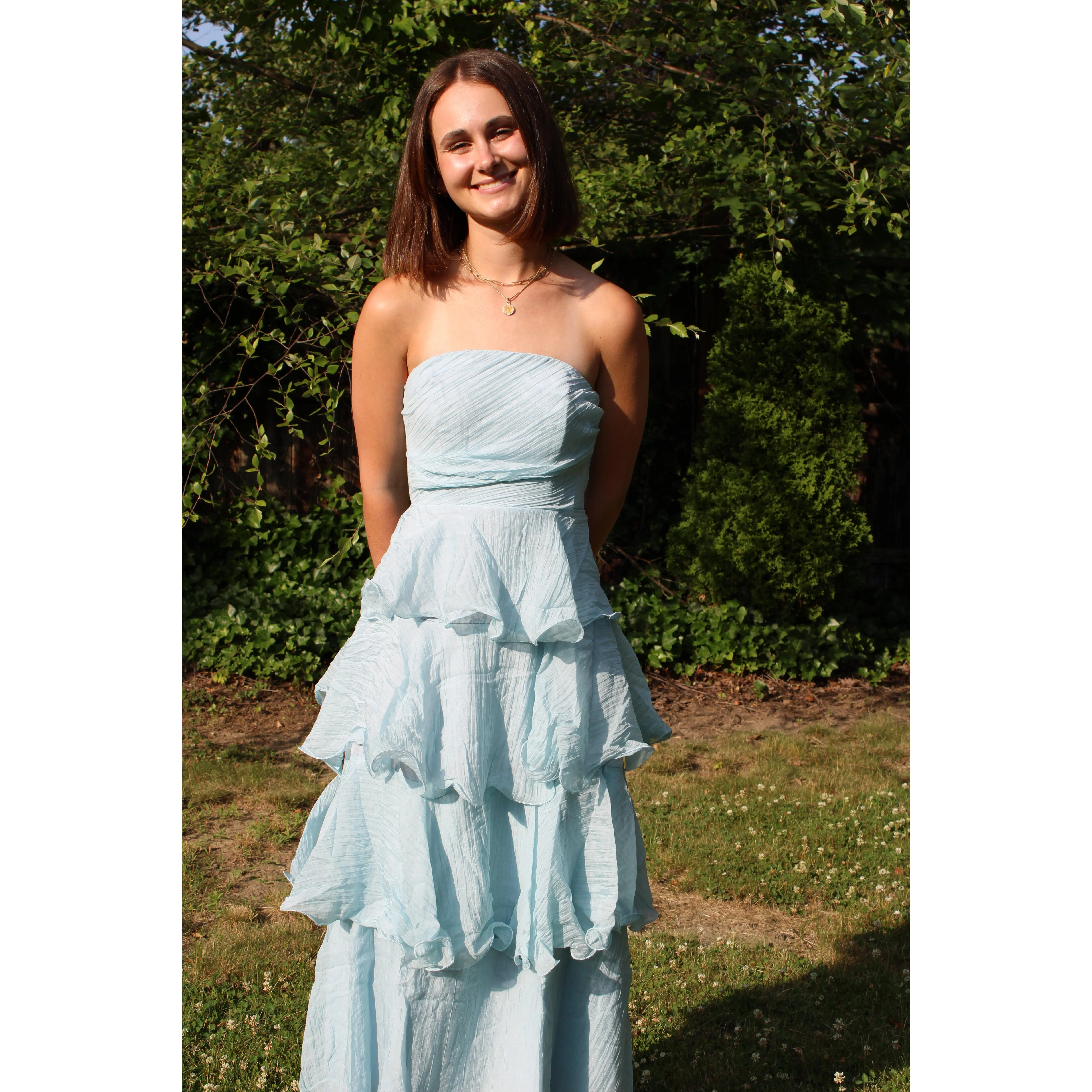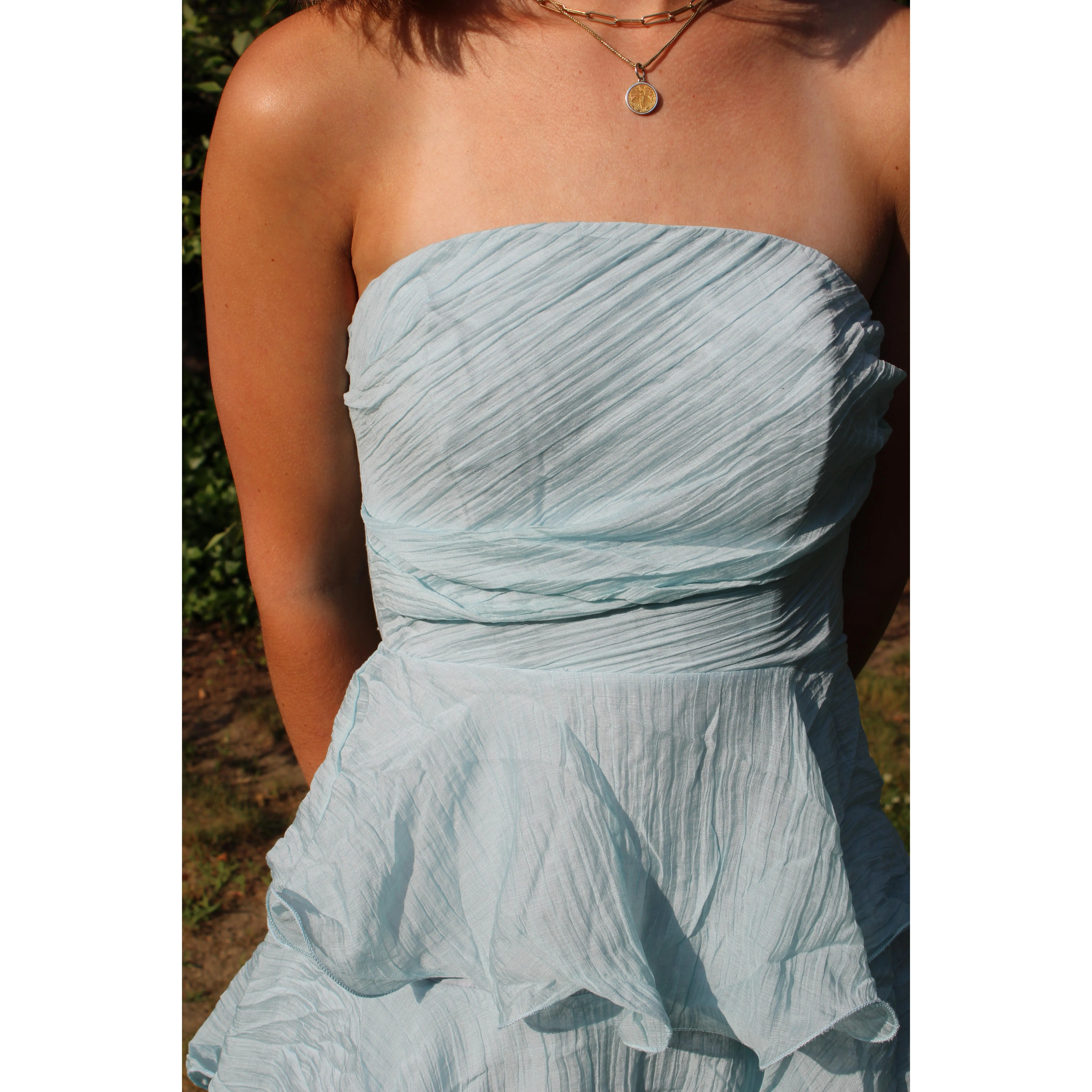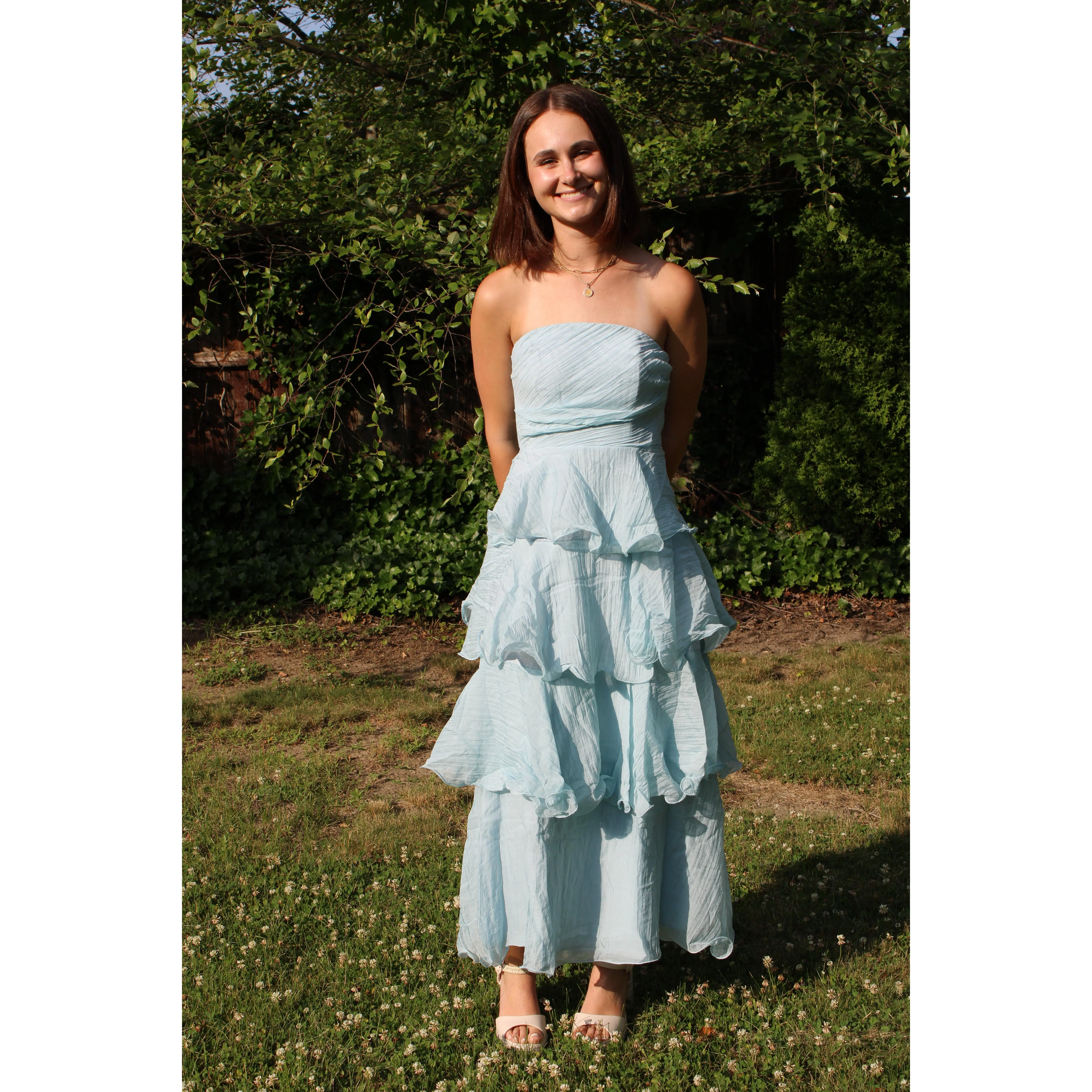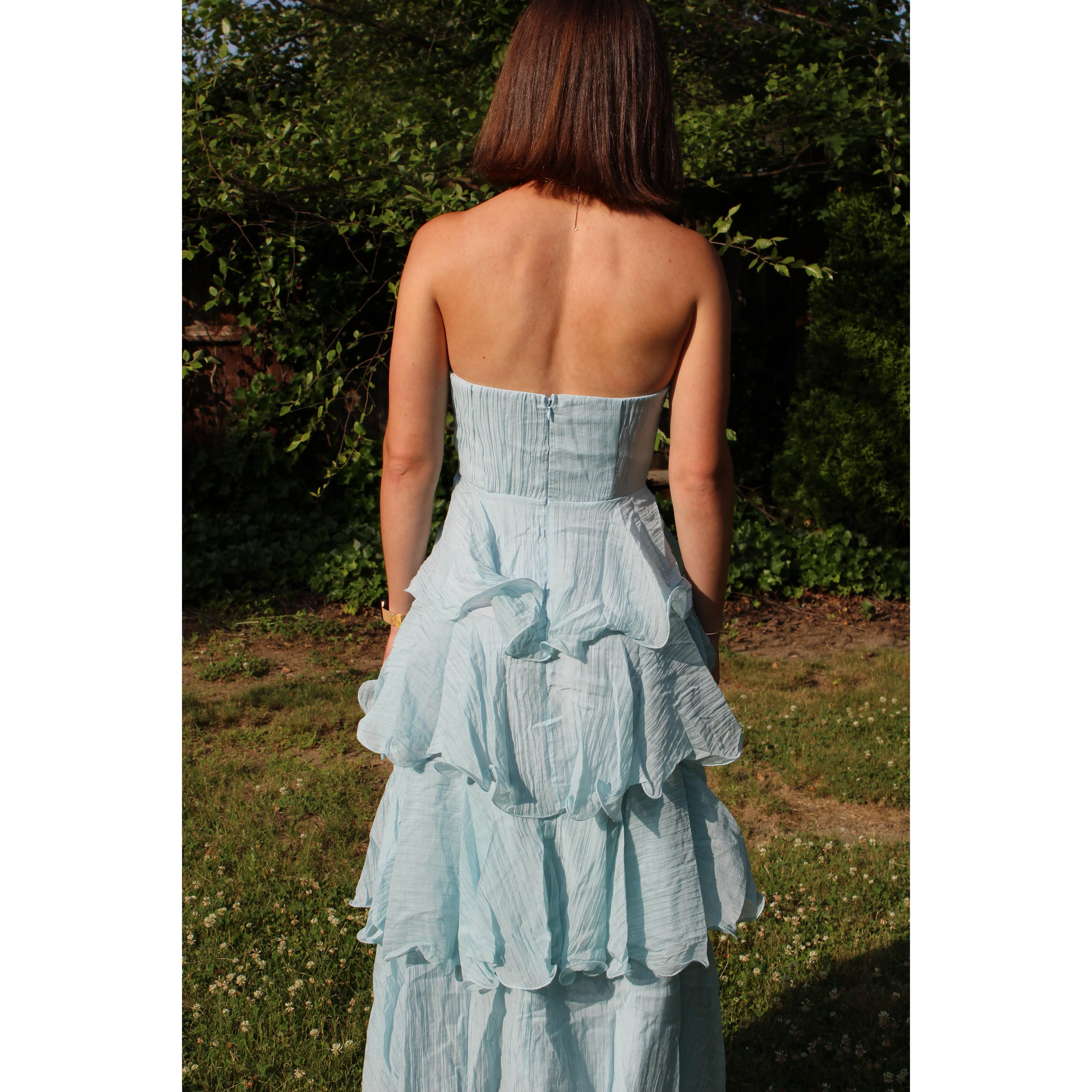 Our Ariel Dress is a Maxi Length Dress featuring tiered layers, this dress will make you look unstoppable at any wedding this summer! This dress features a zip closure and has a beautiful blue color. You'll be stylish but still ready to dance all night long!