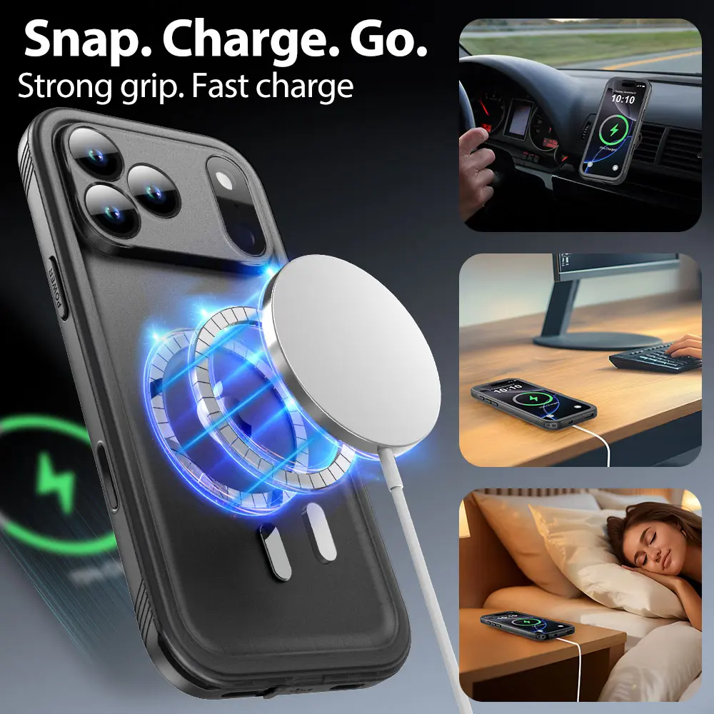 Every case supports MagSafe & Wired charging — no need to remove it. For a stronger magnetic grip, go with the Pro Magnetic version. ⚡