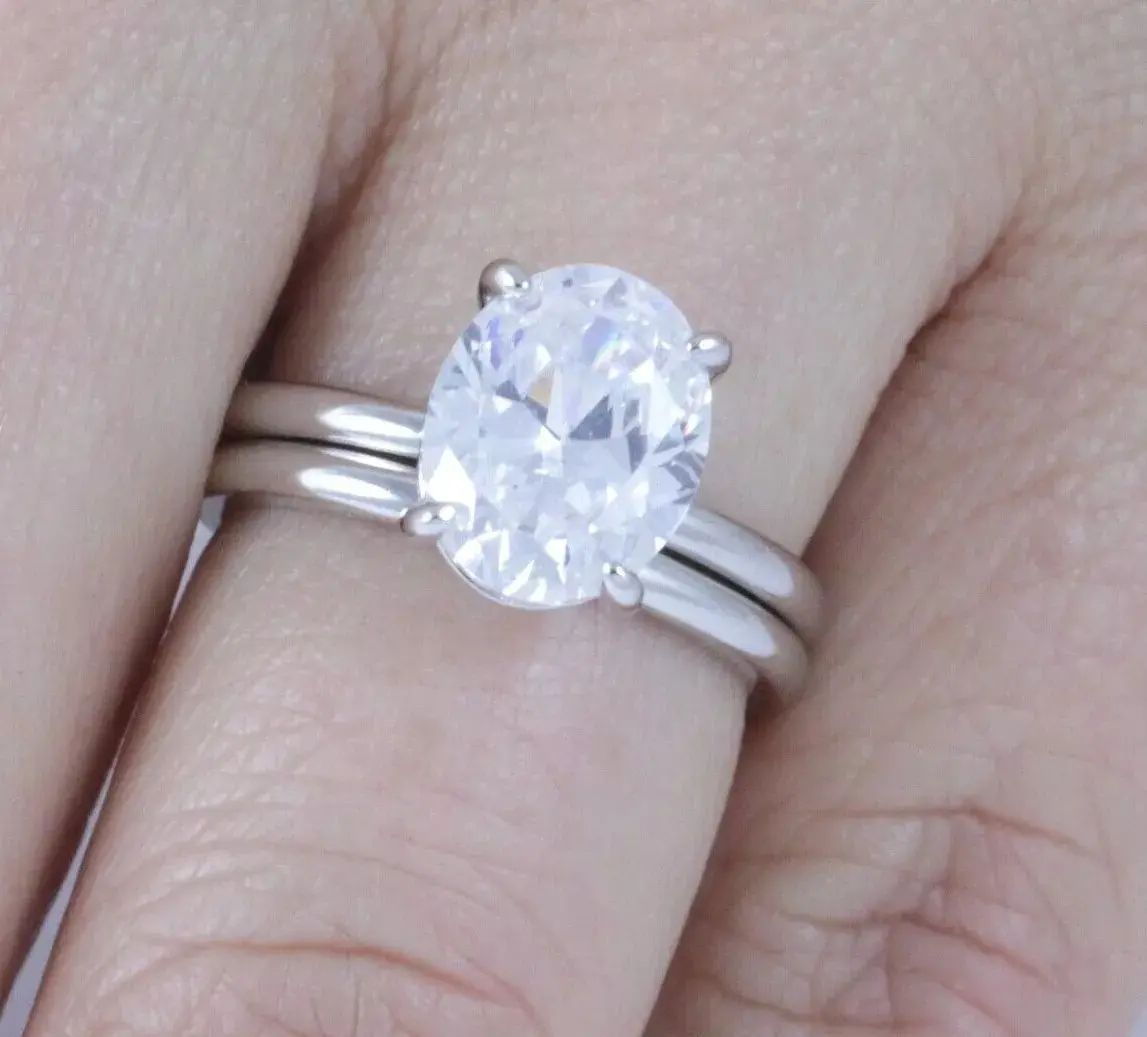 You are looking at gorgeous oval cut CZ .925 sterling silver engagement ring and wedding band set. The engagement ring features a 10X8mm (2.5 Carats) brilliant oval cut stone. Top quality AAA grad Cubic Zirconia display amazing enriched clarity just like real diamonds! Total carat weight is approx. 2.5 carats diamond equivalent. Set in .925 sterling silver (stamped) and finished with rhodium plating for maximum shine and protection (platinum look).