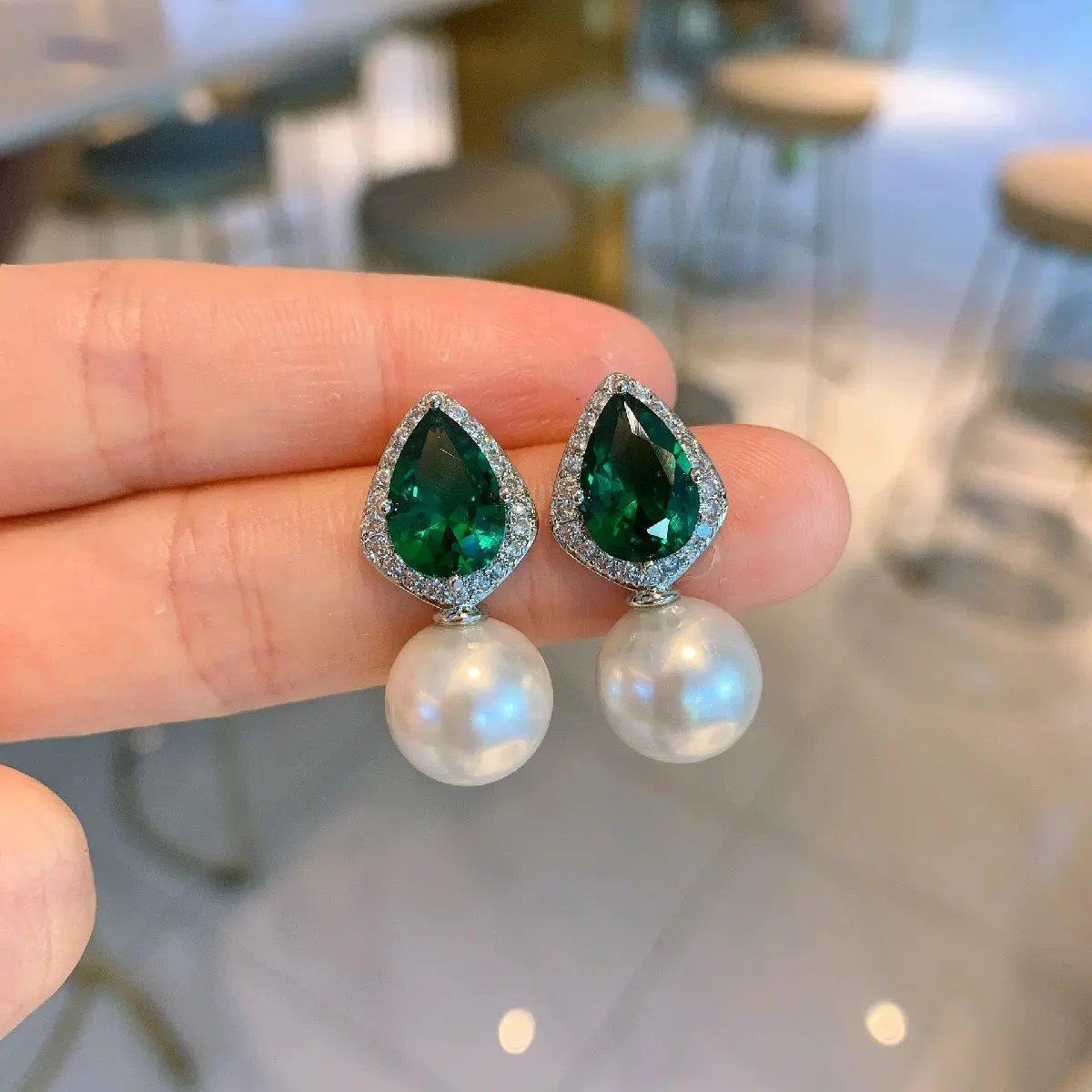Tik Tok hot style green spike crystal pear-shaped necklace European and American earrings jewelry pearl necklace wedding dinner party accessories