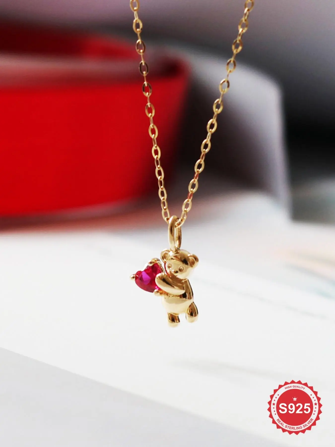 S925 Sterling Silver Bear Artificial Zircon Pendant Necklace with Box, Artificial Zircon Decor Necklace for Women for Gift, Elegant All-match Fashion Accessories for Daily Wear, Exquisite Trendy Pendant