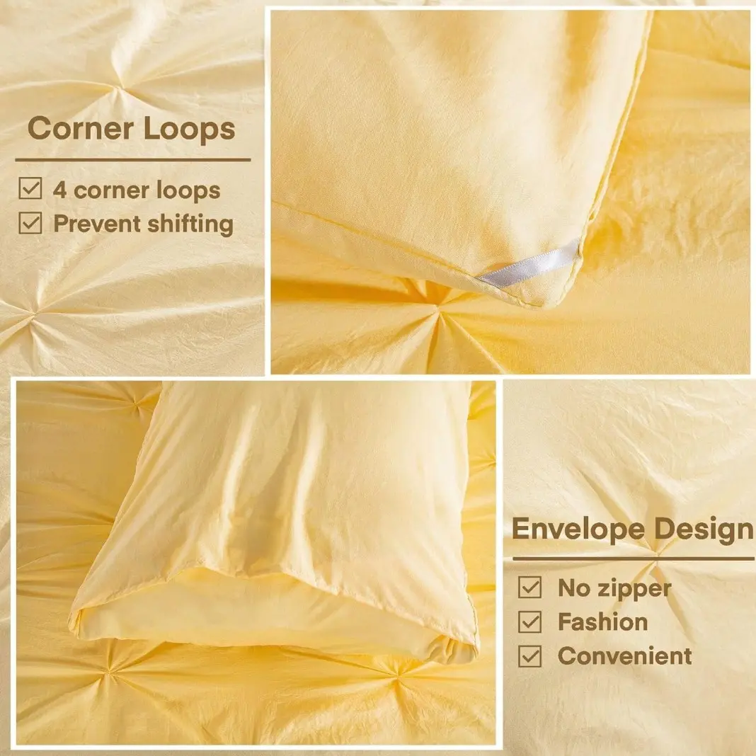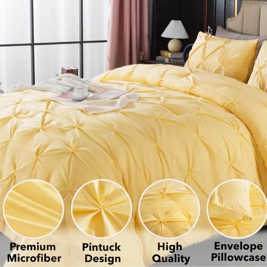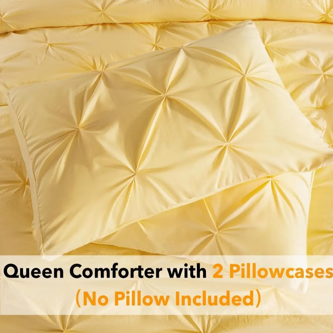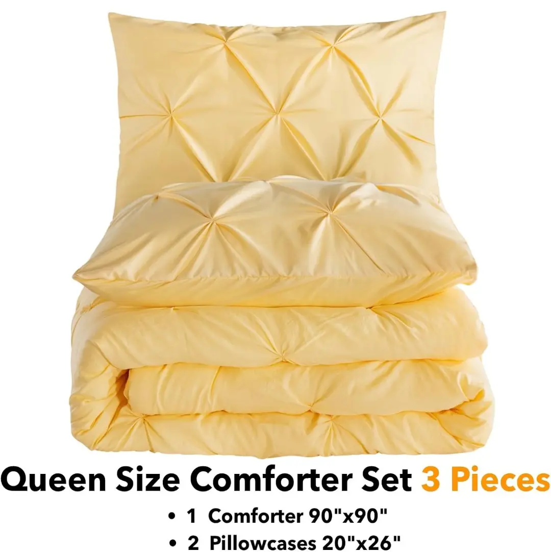 Introducing the Yellow Pinch Pleat Comforter Set, a luxurious and comfortable bedding set that is perfect for all seasons. This set includes a Queen-sized comforter (90x90Inch) and two pillowcases, all made of microfiber material. The comforter features a unique Pinch Pleat design that adds a touch of elegance to your bedroom decor.