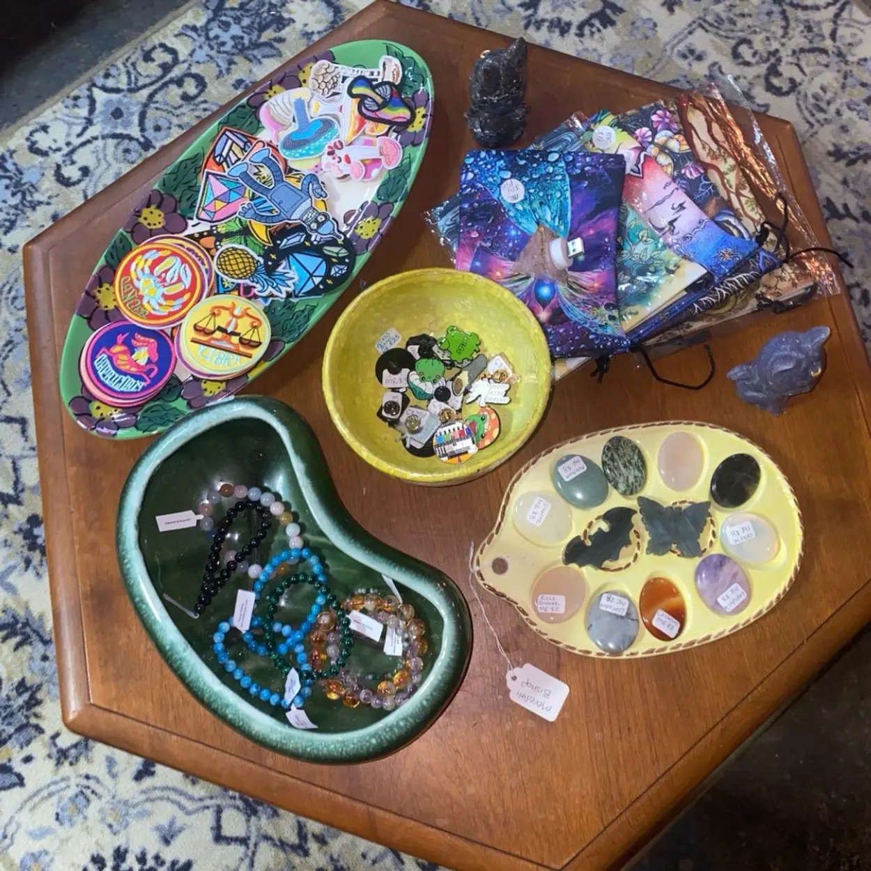 $35 box: 5 items usually 1 3-4” tower, sphere w stand, palm stone, small carving or raw piece , bracelet or ring
