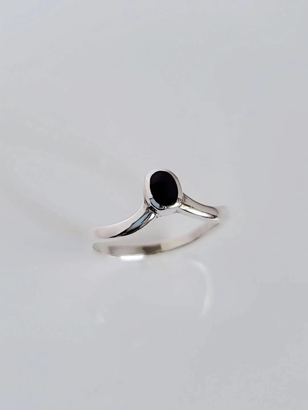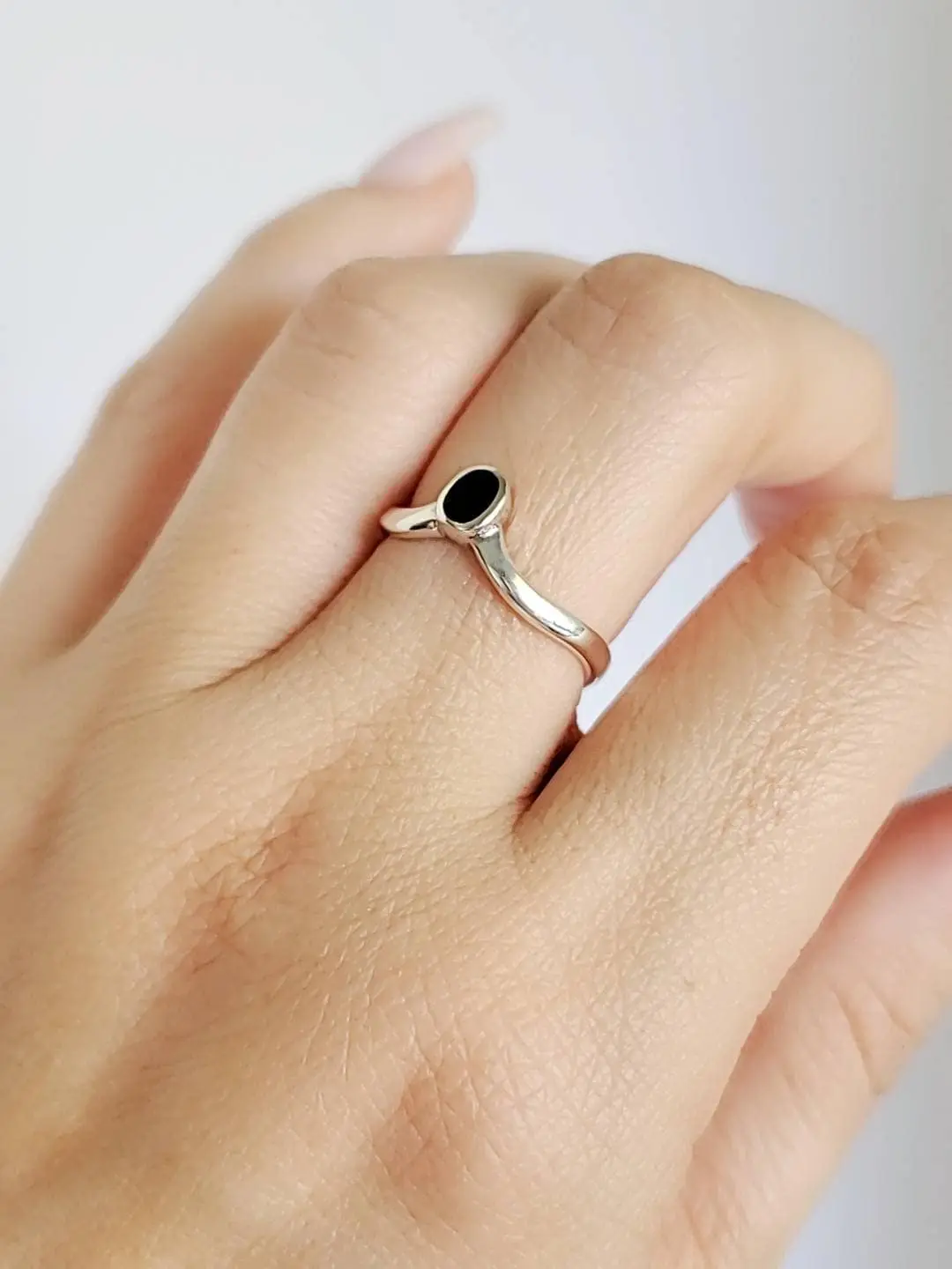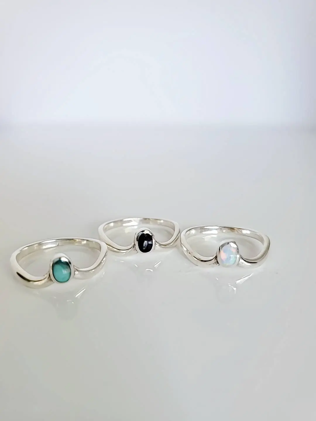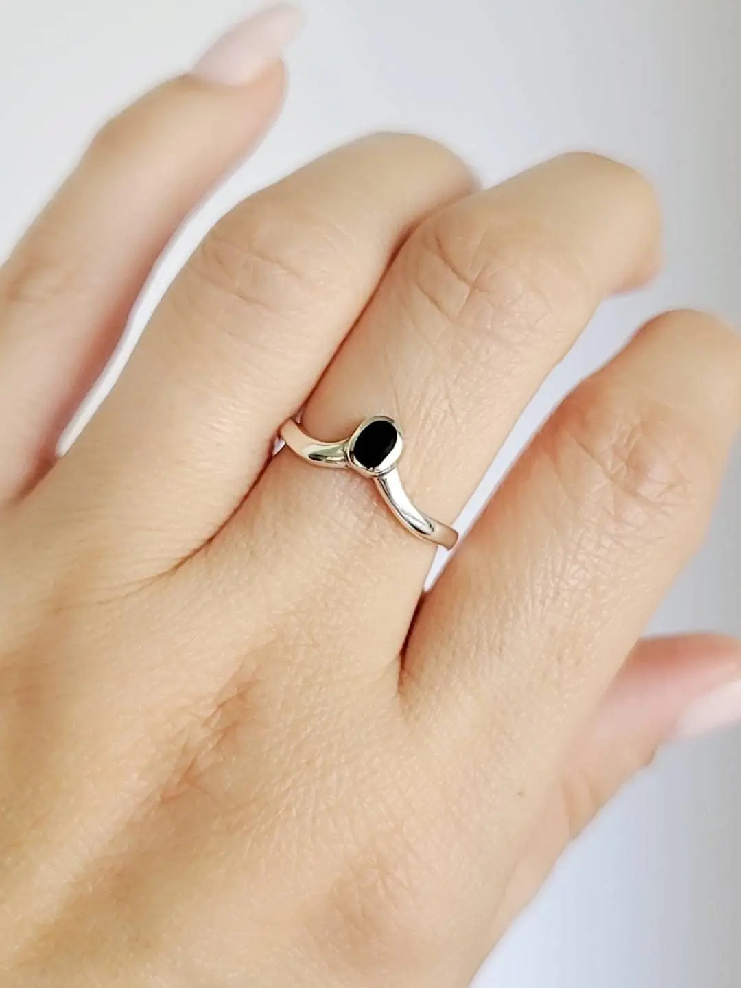Make a subtle yet striking statement with this dainty chevron ring. Crafted from 925 sterling silver, it features a captivating oval onyx stone. The sleek chevron band offers a modern take on minimalism, perfect for stacking or wearing solo. Available in turquoise and rainbow opal variations for added versatility.