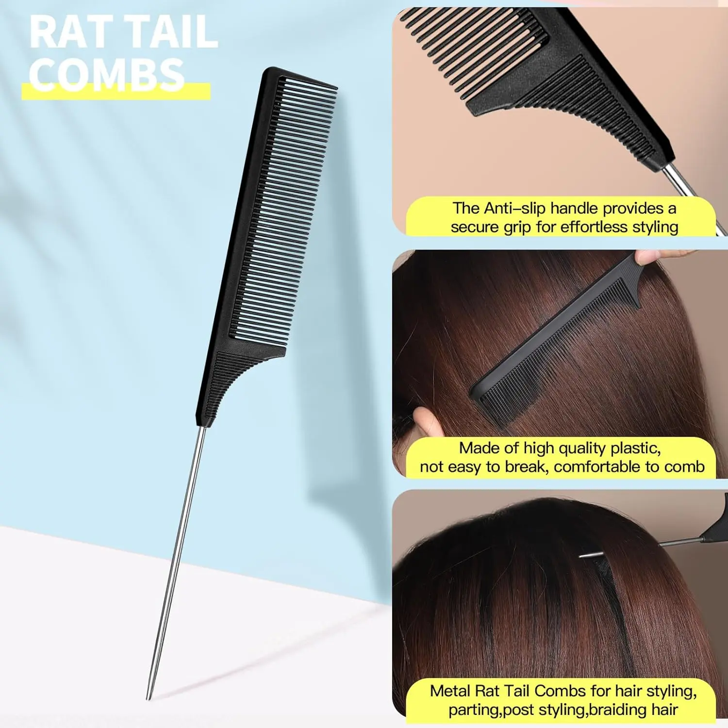 ·1PCS RAT TAIL COMB Designed with stainless steel tail and fine teeth, the rat tail comb great for hair styling. Made of High quality ABS material, the hair comb are anti-static, heat-resistant and extremely long-lasting . Meanwhile, the stainless steel tails are great for styling, parting, coloring, and backcombing. The rat tail comb is great for different hair types, whether straight or curly. Ideal for trimming, backcombing and lifting groomed hair.