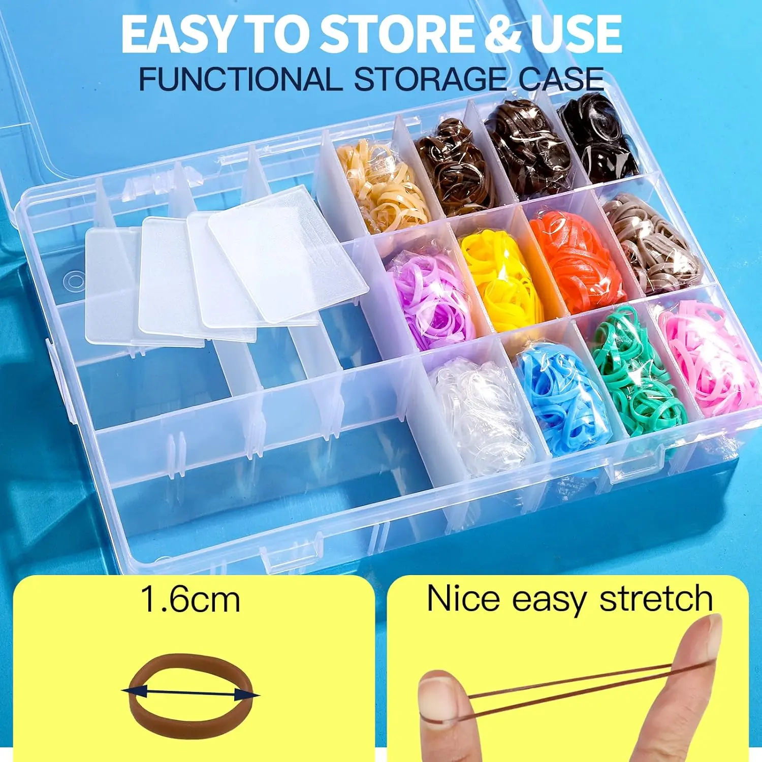 ·FREE PLASTIC ORGANIZED BOX The ponytail holders come perfectly organized in plastic organized box. Individual compartments inside the clear container keep them neatly organized and make it easy to choose your favorite colors for styling and securing tiny braids, puffs, and more! You can adjust the size of each compartment to be bigger or smaller to your liking. Pigtails, ponytails, braids… the possibilities are endless with this set of 1500pcs rubber bands for hair.