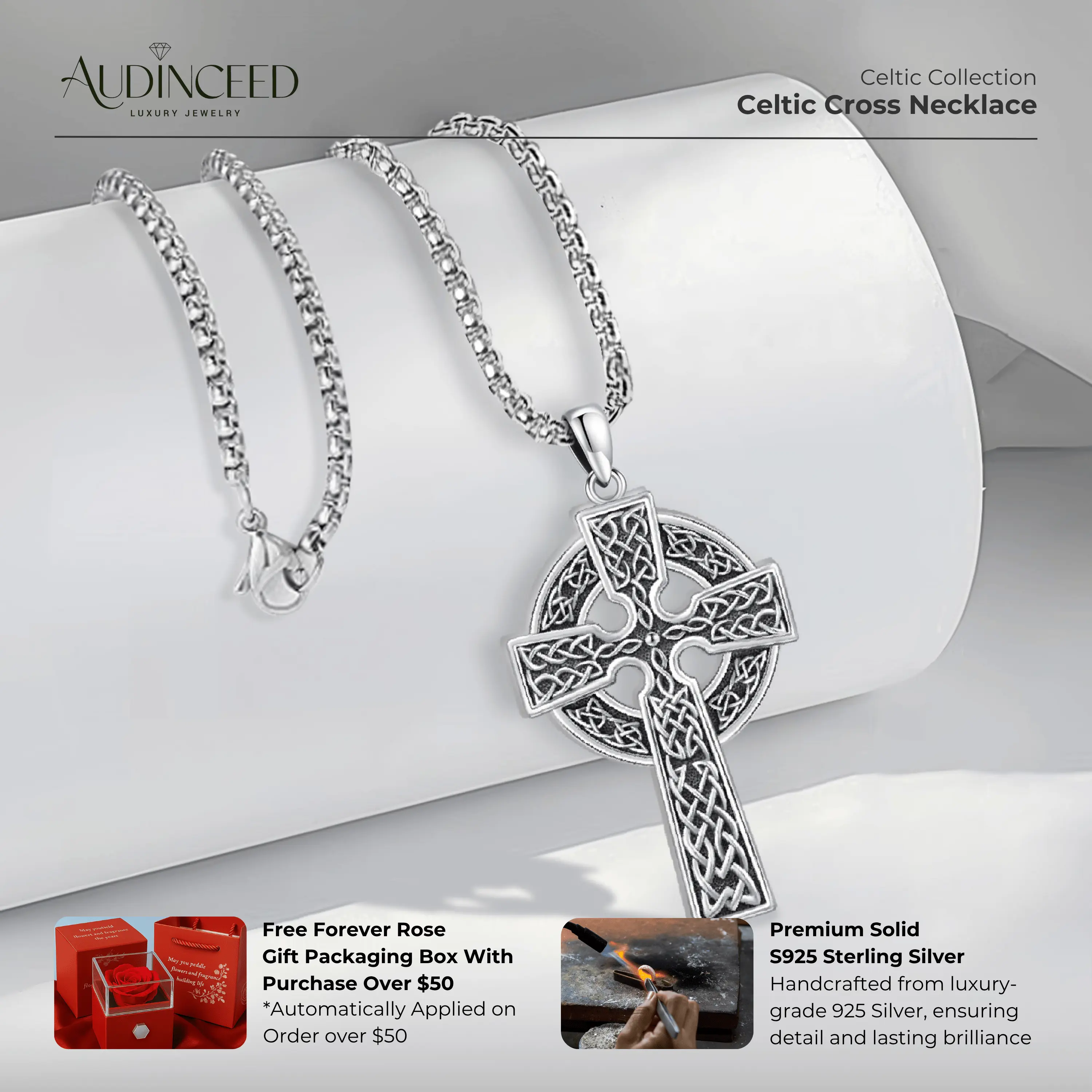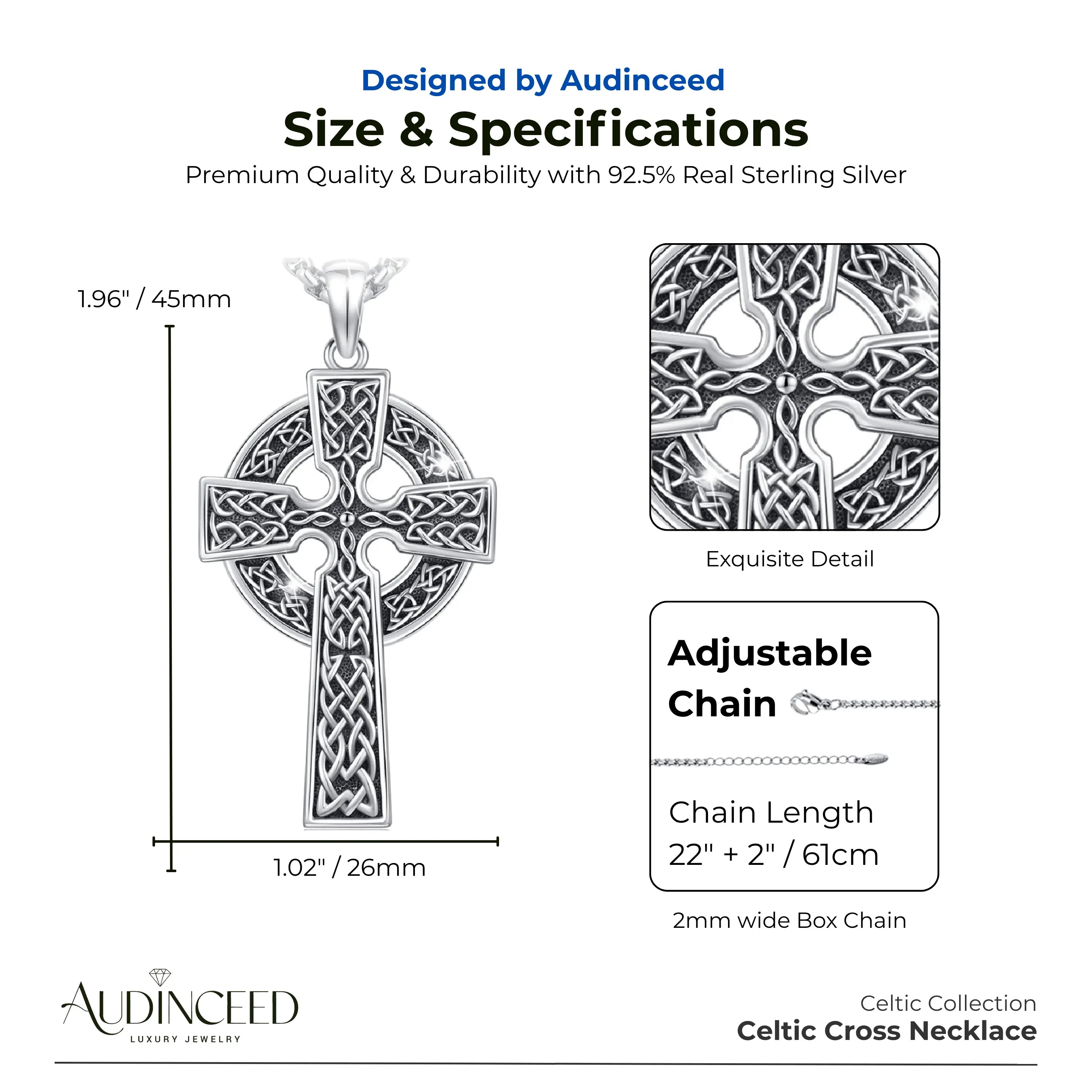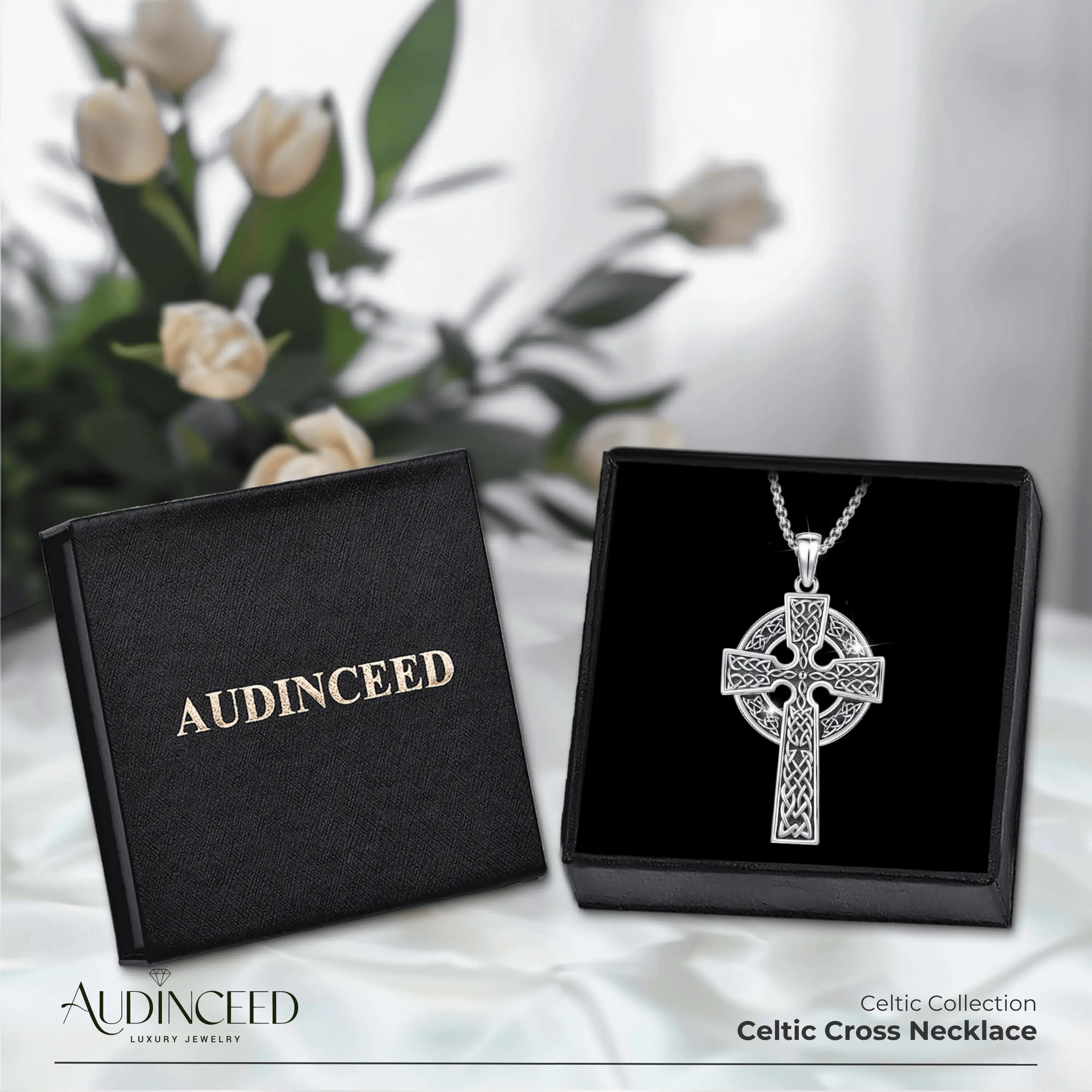 AUDINCEED Celtic Cross Necklace for Men Women, 925 Sterling Silver Celtic Knot Cross Pendant Irish Knot Crucifix Jewelry
