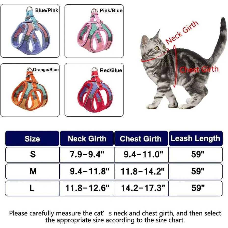 ·Step-in Cat Harness:The cat harness design in step-in style and multi-color cloth stitching in good looking, whether it is training or walking. Reinforced Stitching - 360°Rotating Clasp Metal Hook -Reflective Pet Leashes sturdy,good quality can last a long time.