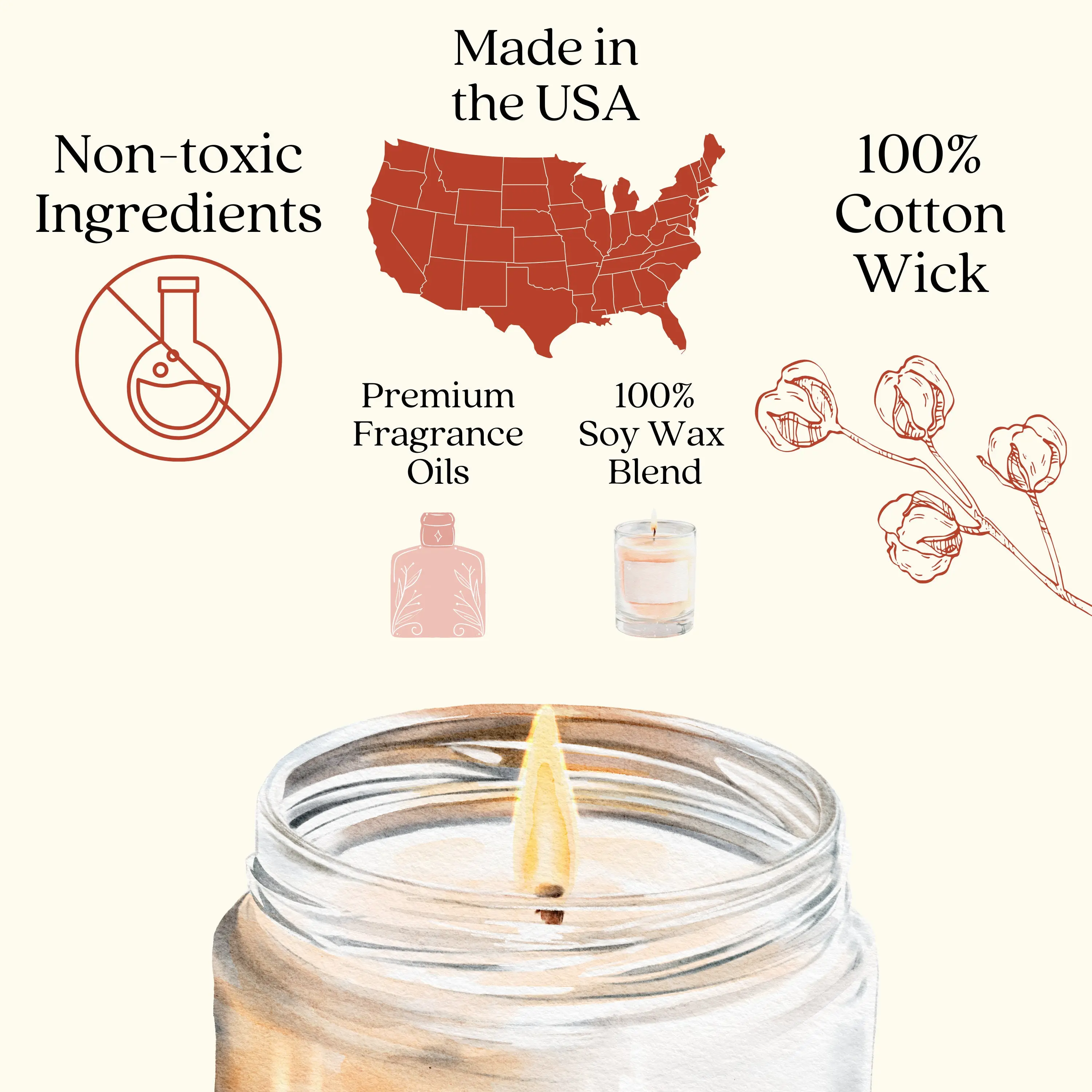 They come in a 9oz glass jar and have a standard size of 2.8″ × 3.5" (7.1cm × 8.8cm). Each candle is made with a 100% natural soy wax blend and features a 100% cotton wick, along with a permanent adhesive label.
