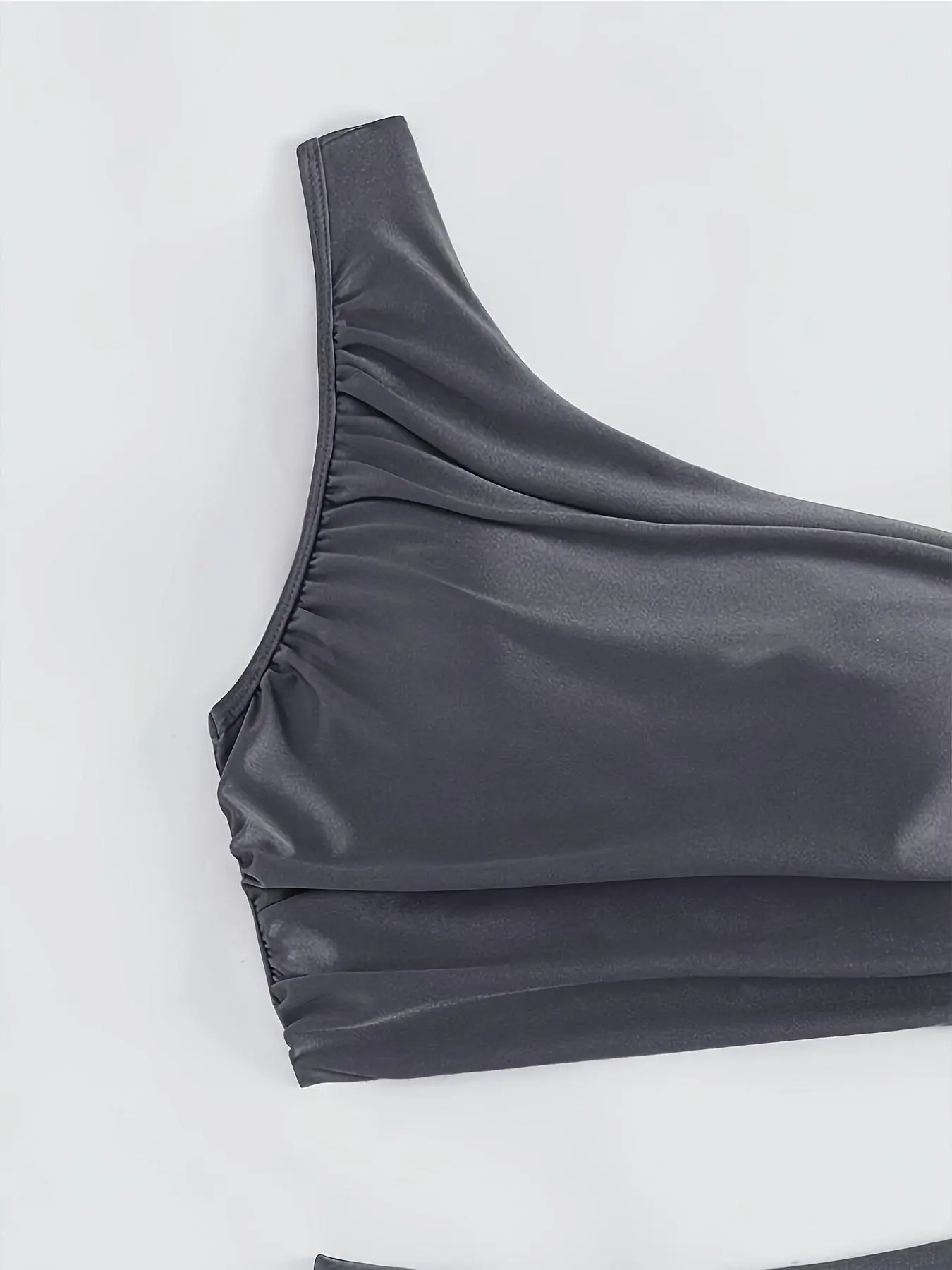 Ladies' pure-colored asymmetric-neck sleeveless pleated slim-fitting split swimsuit, Solid Ruched Swim Suits, with a shiny fabric that shines like stars, 2026 new, suitable for vacation, hot spring tourism, and gatherings, high-waisted