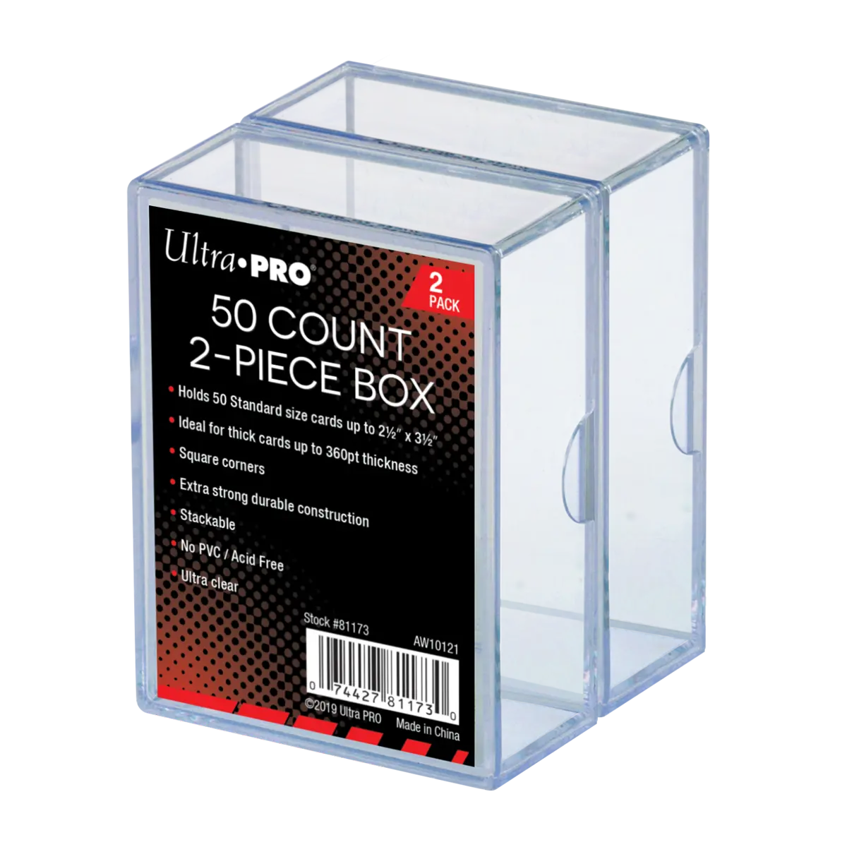 Ultra-clear, heavy-duty boxes have snug fitting semi air-tight closures. This 2-piece box holds up to 50 Standard Size cards. Square corners to help prevent damage to card corners. Stackable for easy organization and storage. 2 boxes per pack.