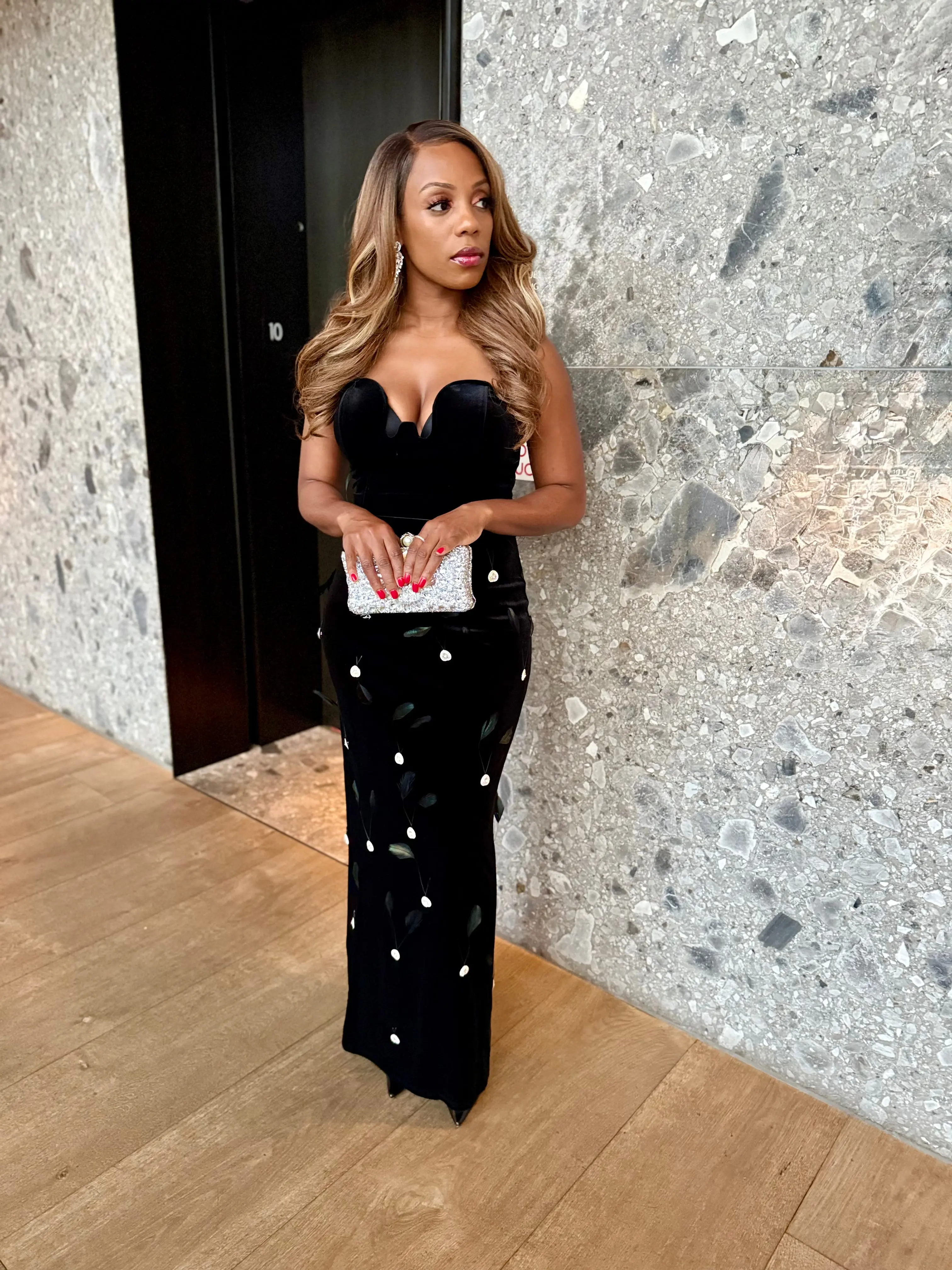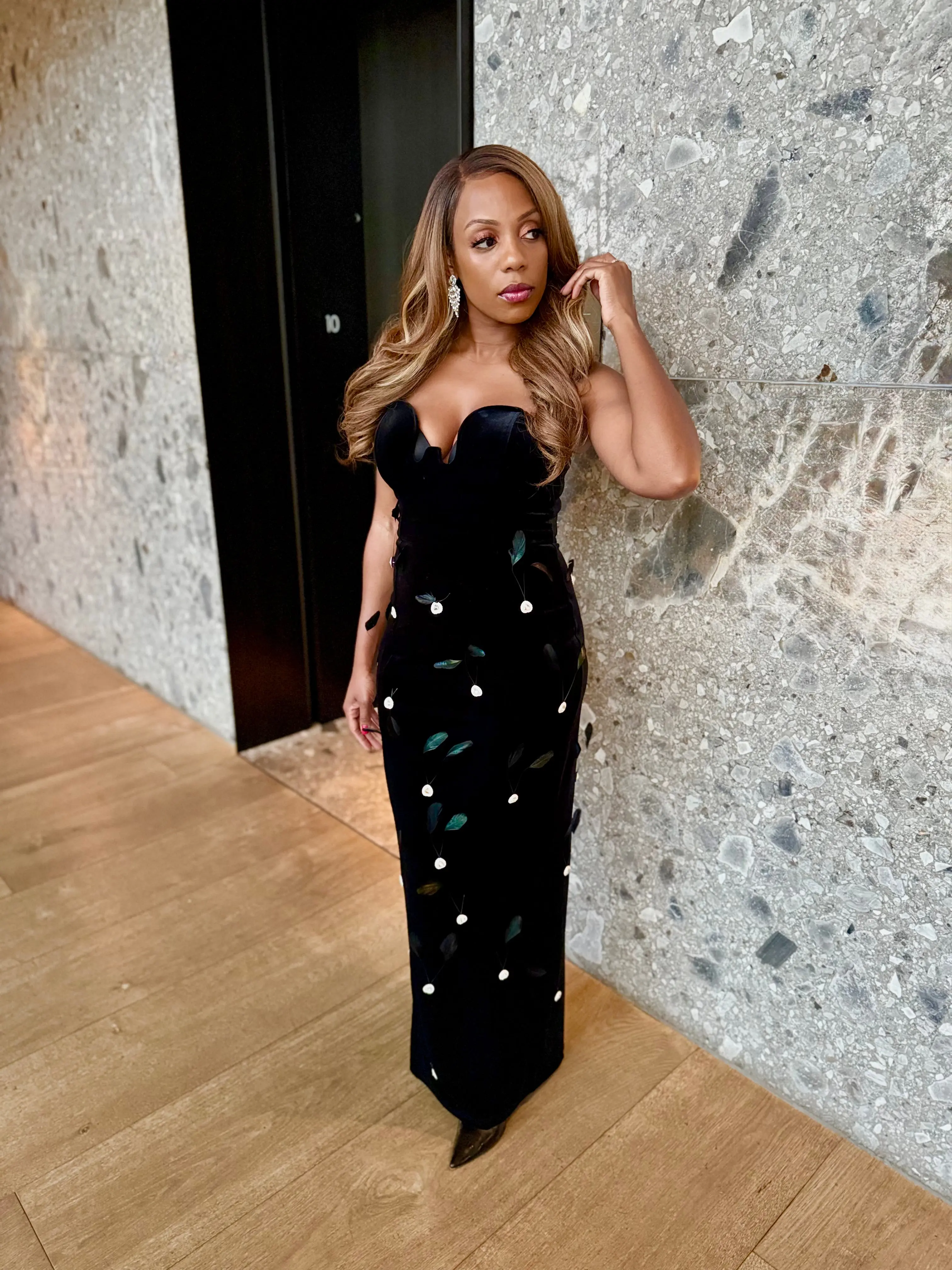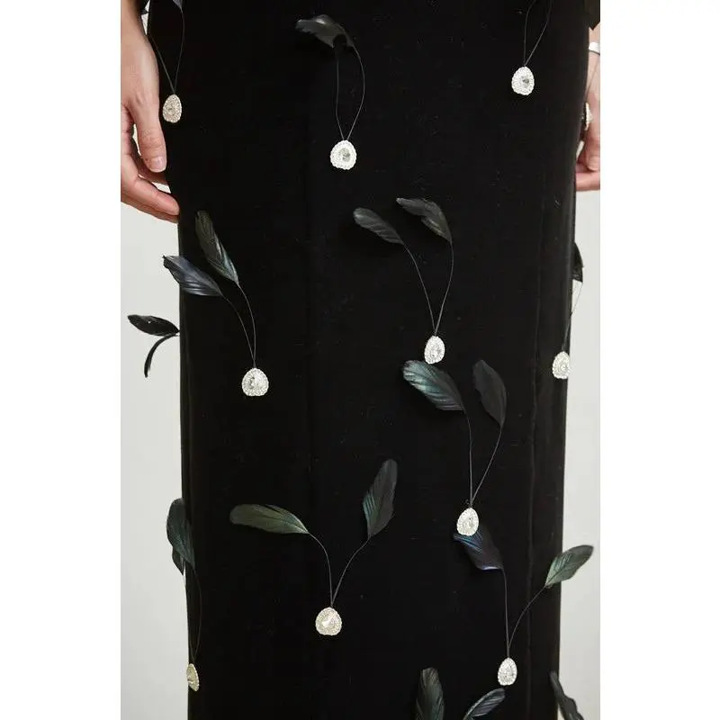 Indulge in luxury with our Desi Rhinestone Feather Maxi Dress. The lush velvet silhouette is adorned with delicate, shimmering leaf appliques, adding an exquisite touch of elegance. Elevate your style with this premium dress, fit for the most exclusive occasions.