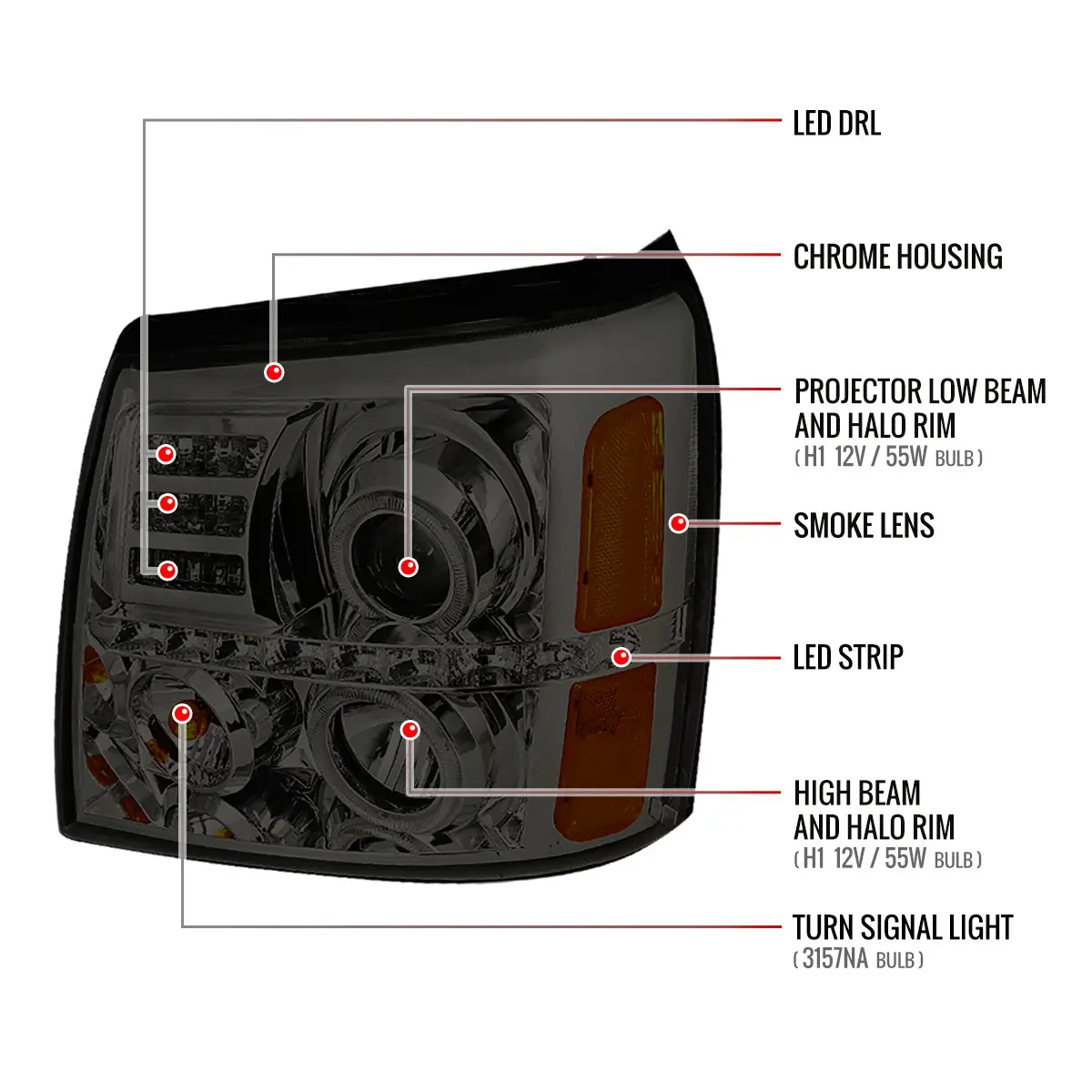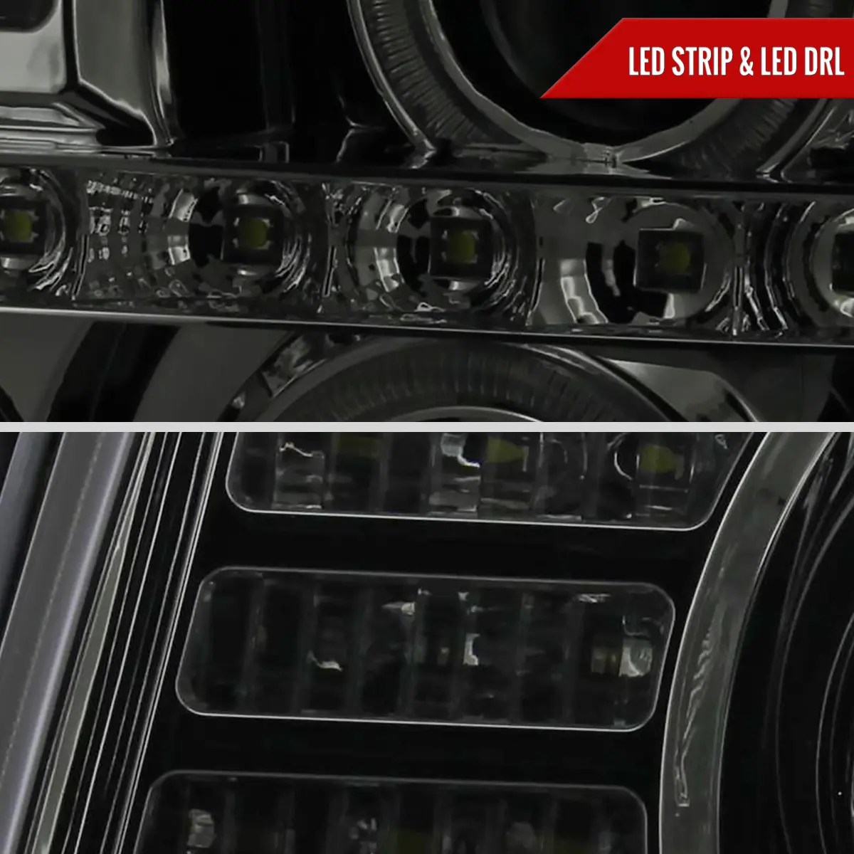·Chrome housing, smoked lens dual halo projector headlights with SMD LED light strip