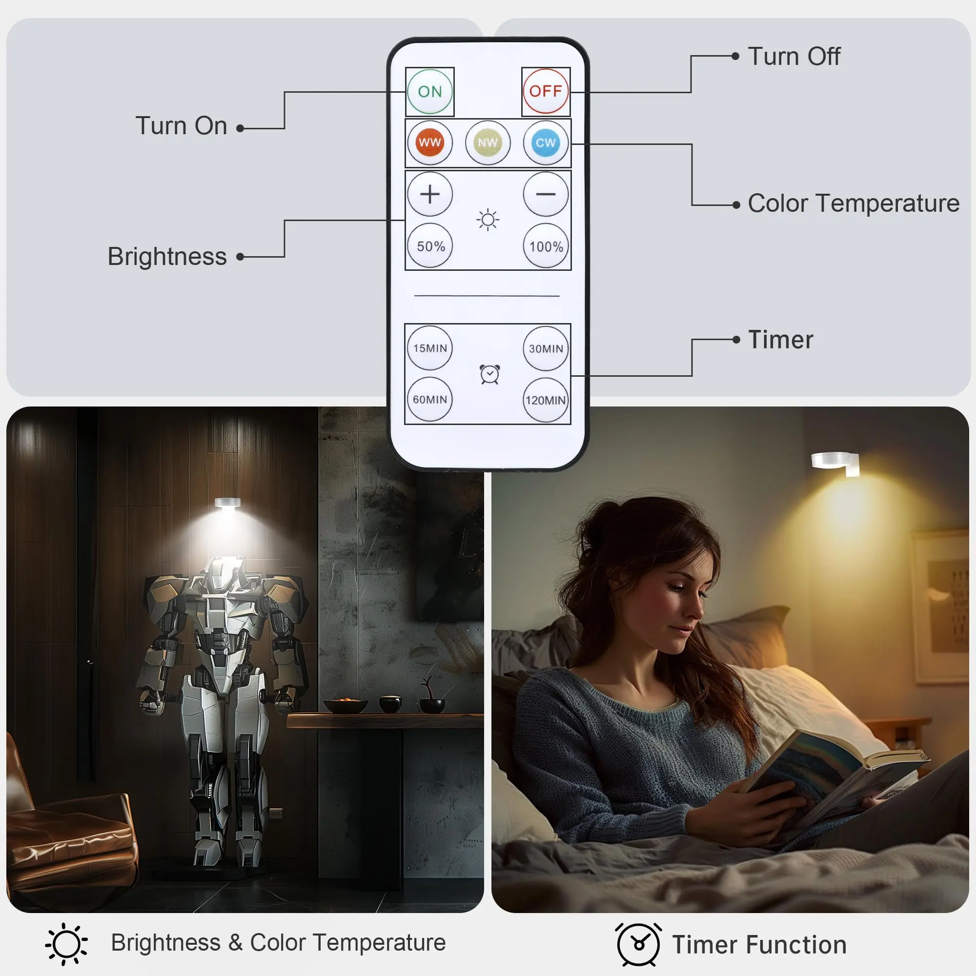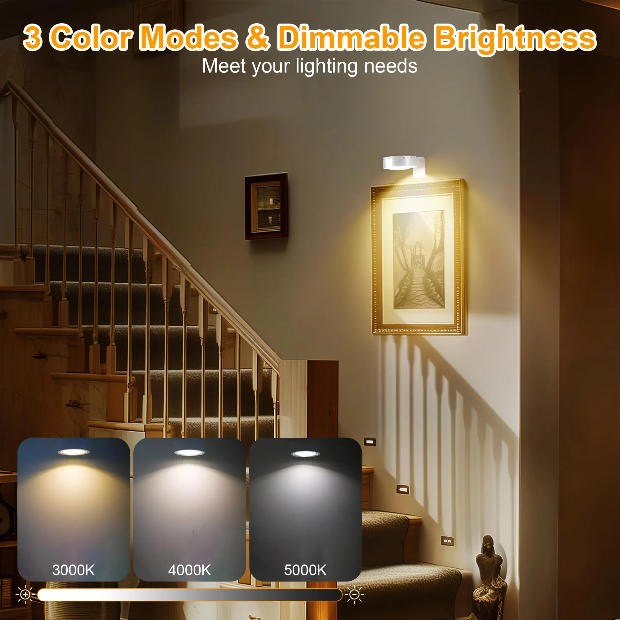 ·Versatility: 3 lighting modes(warm white/ natural white/ cool white). Dimmable: 10-100% brightness adjustment. Timing Functions: Set the picture light to turn off automatically after 15, 30, 60, 120 minutes. Lights can be set by remote control or manual touch
