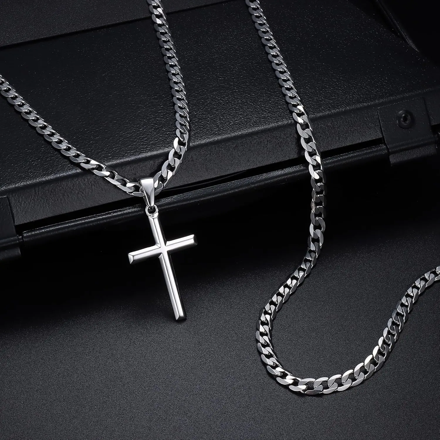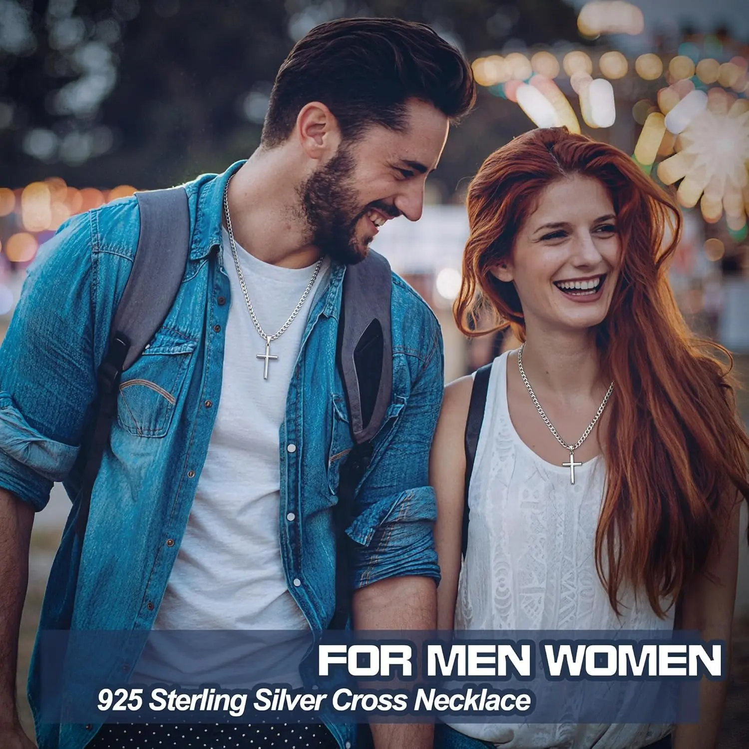 Trendy 925 Sterling Silver Cross Necklace for Men Women Durable Non Tarnish Beveled Edge Crucifix Pendant Cuban Link Chain Jewelry 16-30 Inches Valentine's Day
