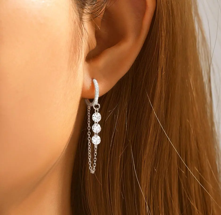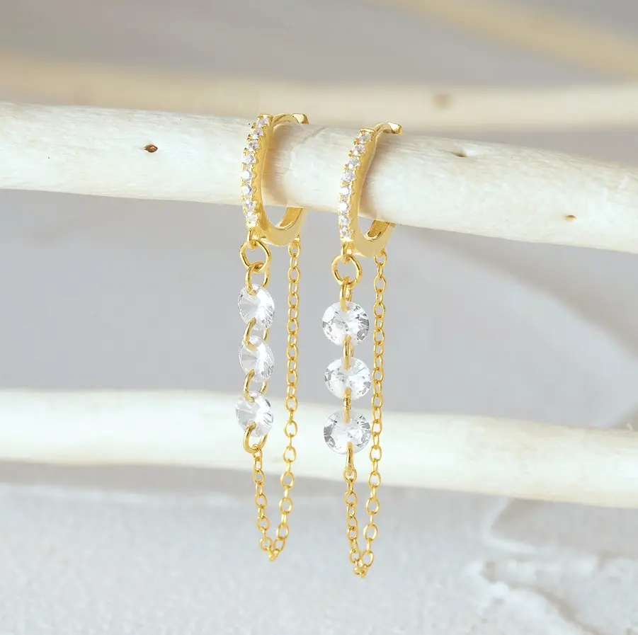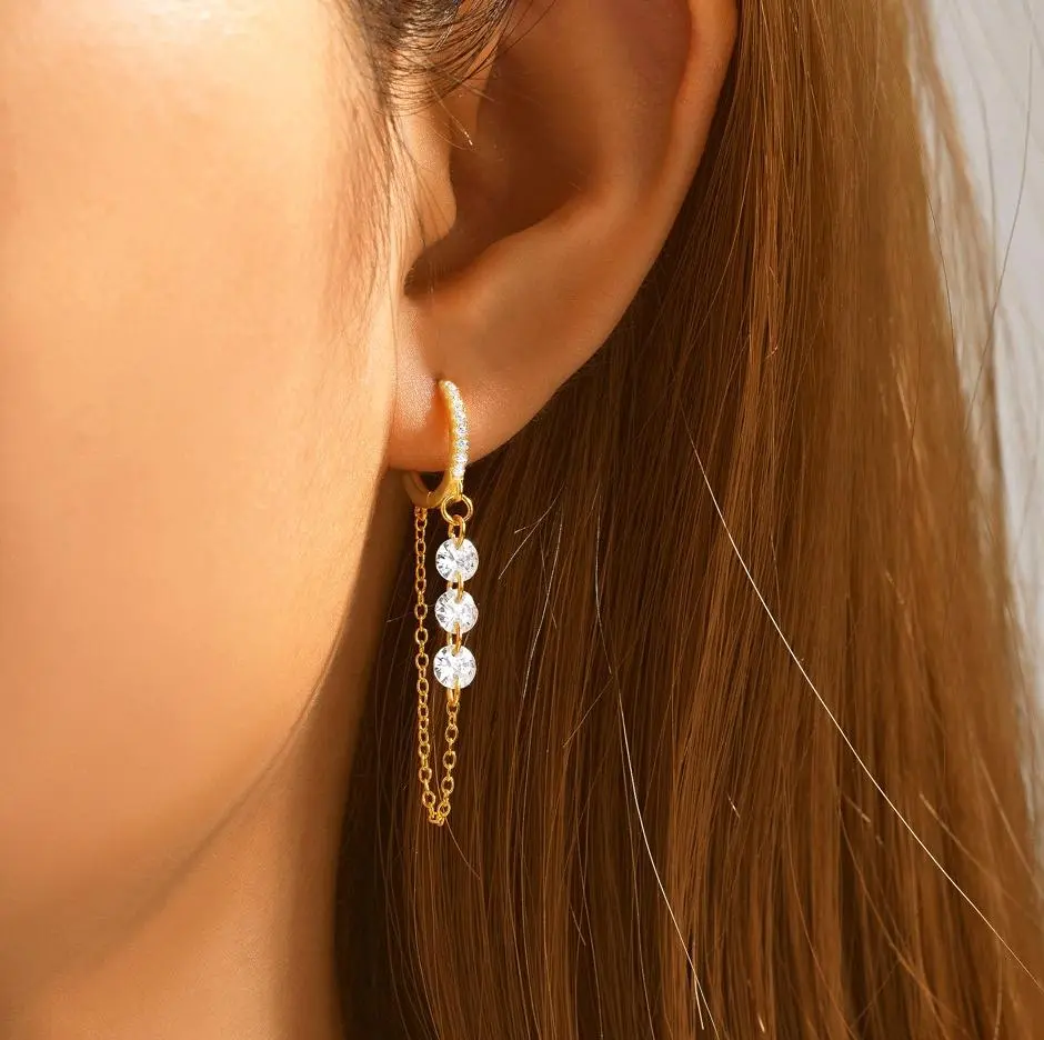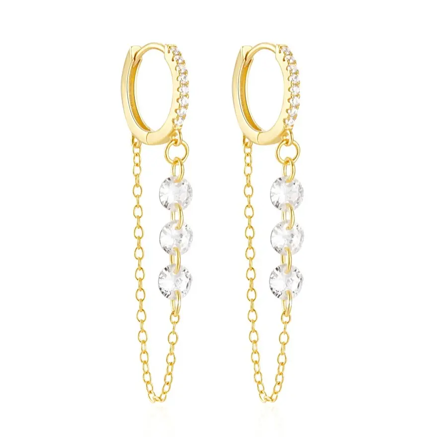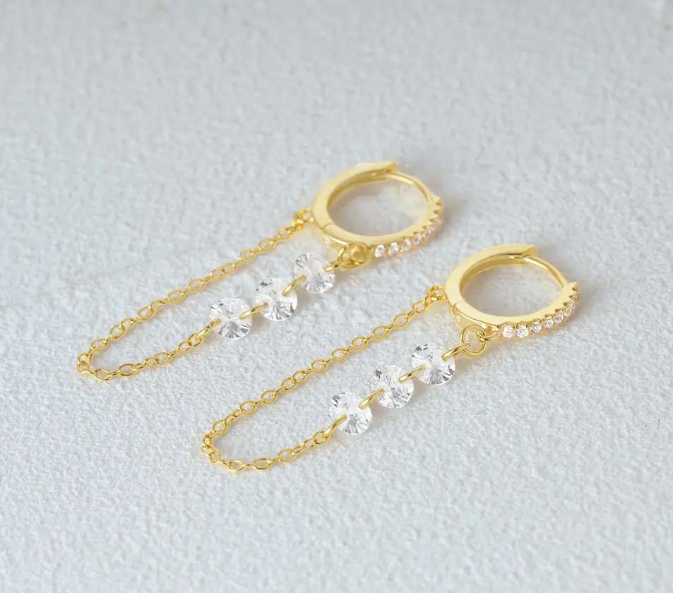 These beautiful and stylish earrings are crafted from 925 sterling silver with an 18K gold-plated finish. Featuring with three shinning zircon stones linked by delicate chains.
