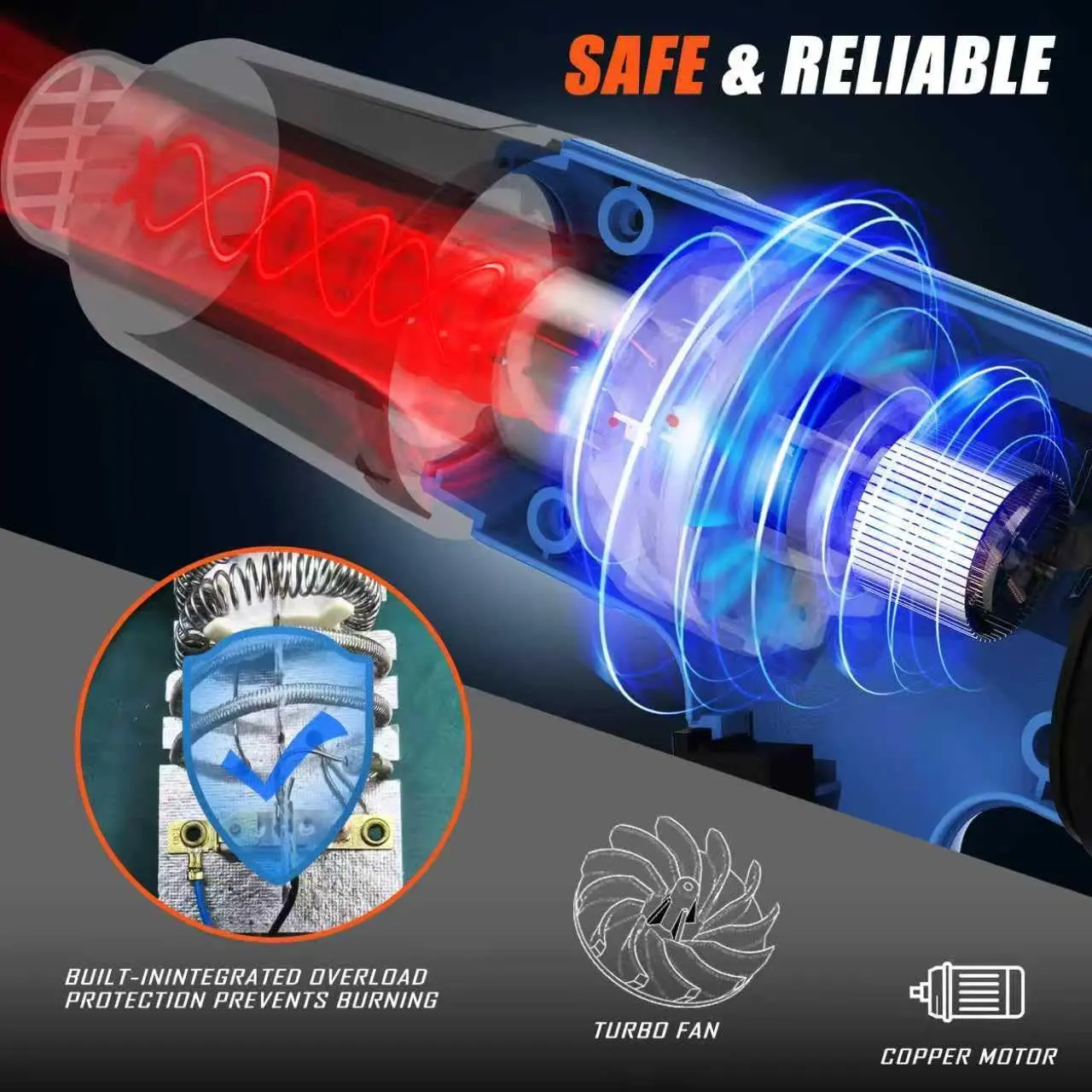 【Quality Materials & Overheat Protection】The body of the heat gun is made of ABS engineering plastic with excellent heat, moisture and corrosion resistance. The grid-type air outlet makes the wind speed stable and will not damage the hardware. Built-in overheat protection device. When the temperature is too high, the heat gun will automatically enter the sleep state to avoid damage to machines or electronic circuits
