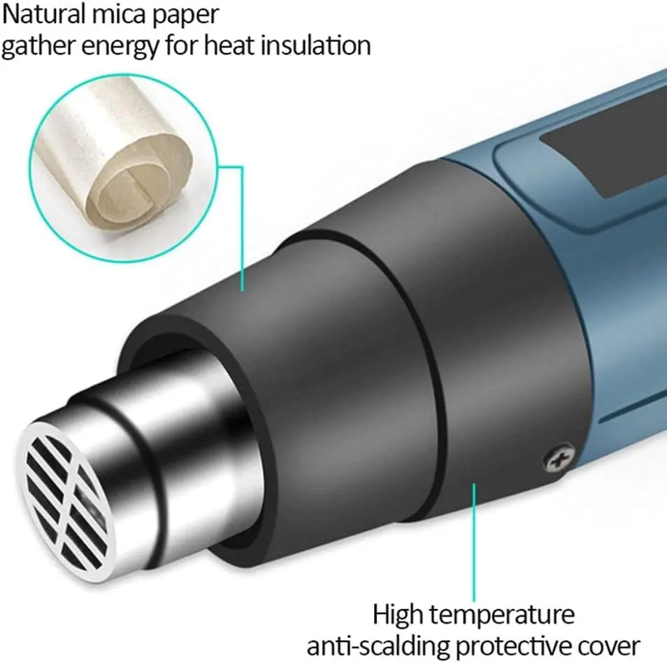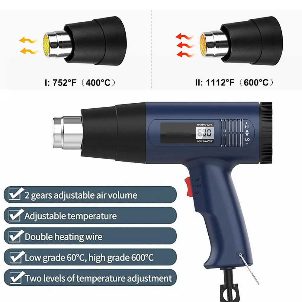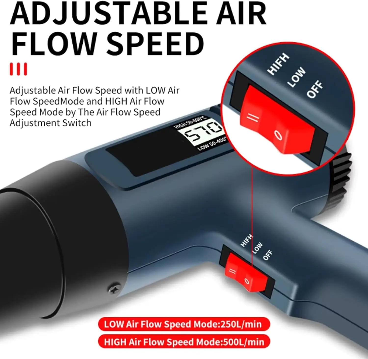 【Strong Power With 2 Modes】2500W heat gun provides strong power quickly heat up to 1112℉(600℃) in 1.5 seconds. Two modes: I: 60℃-400°C(140℉-752°F) , 350L/min; II: 60°C-600℃(140°F-1112℉), 500L/min