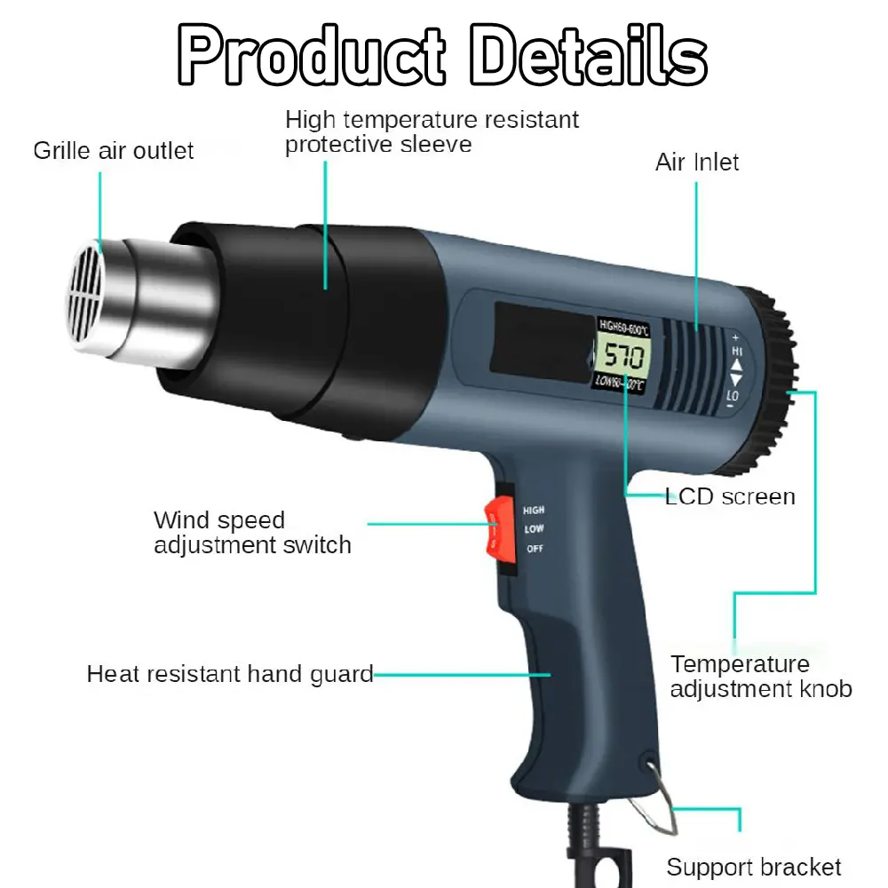【Variable Temp Control & Overload Protection】 Unlike other dual temperature heat guns, our heat guns provide variable temperature control. The black dial provides rheostat-type heating, the high / low switch on its handle provides air flow control. Temperature range from 60℃ to 600℃; Our heat gun also possess overheat protector to avoid damaging your heat gun and circuit