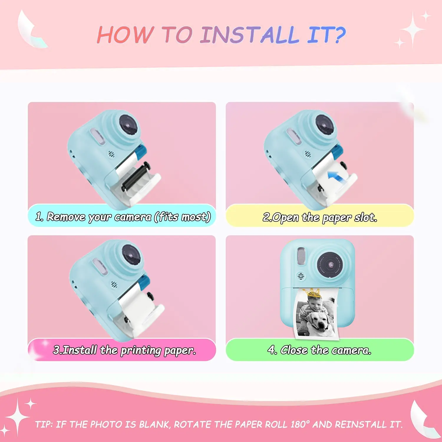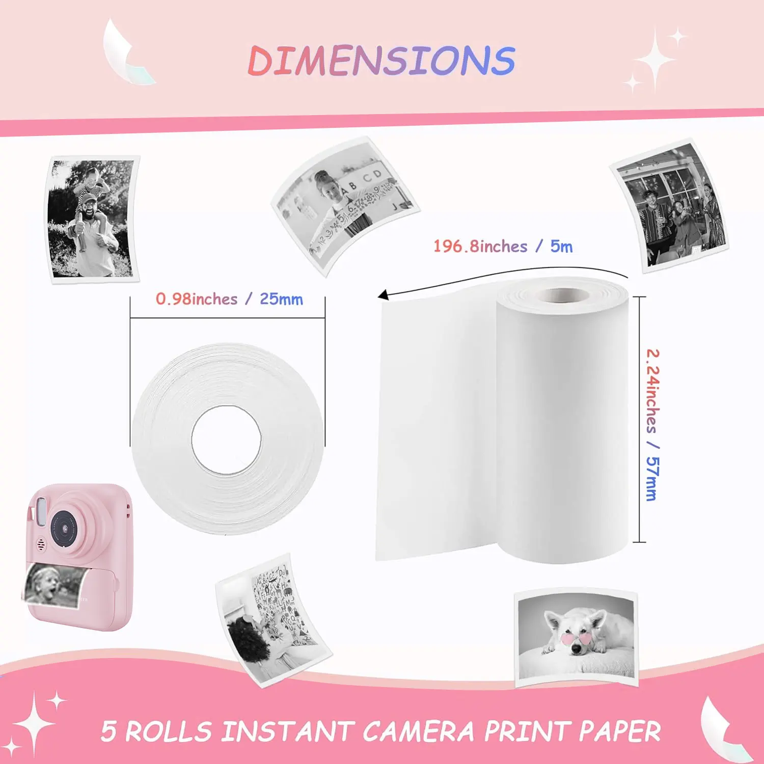 Ever run out of instant print paper right when you want to capture a fun moment? With this 5-roll pack of thermal print paper, you'll never miss a snap! Designed to fit most instant cameras, including popular kids' models, these rolls are BPA-free and inkless, so you can print safely and sustainably. Each roll stretches about 5 meters, giving you plenty of prints for parties, travel, or everyday memories. The HD printing ensures your photos come out crisp and clear, preserving each smile and silly face perfectly. Installing is a breeze—just open your camera's paper slot, pop in a roll, and close it up. If your photo prints blank, simply flip the roll 180° and try again. Ready to keep your memories fresh and vibrant? Grab this 5-pack and let the instant photo fun begin!