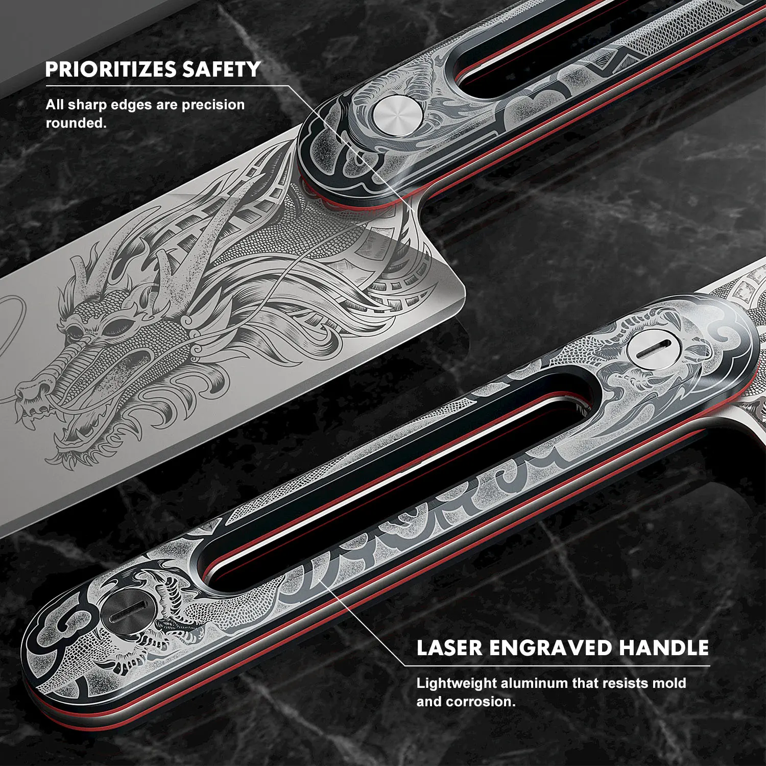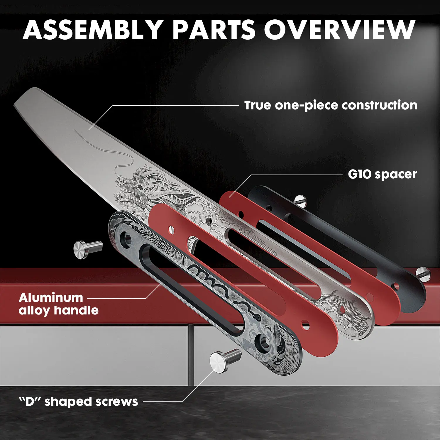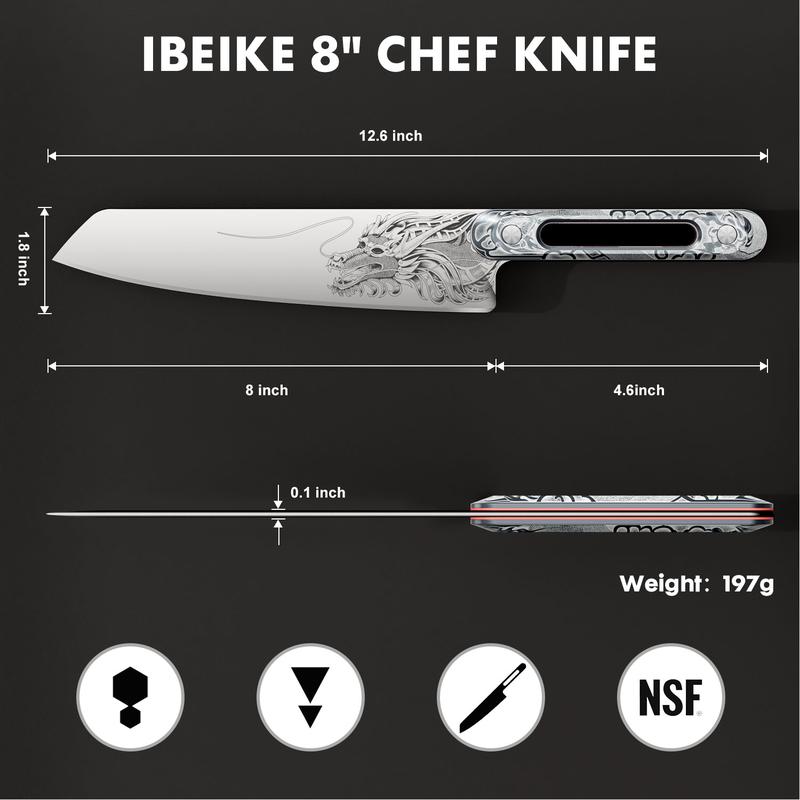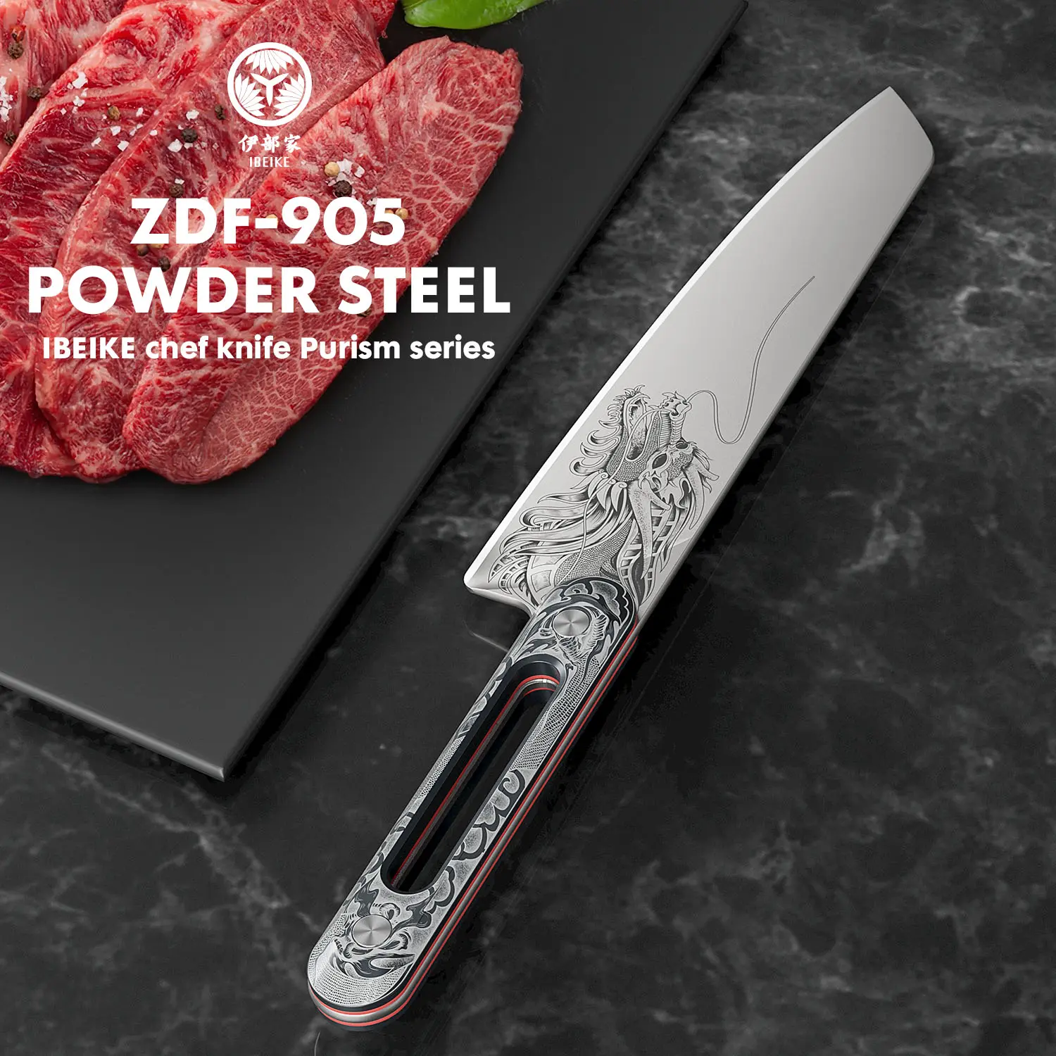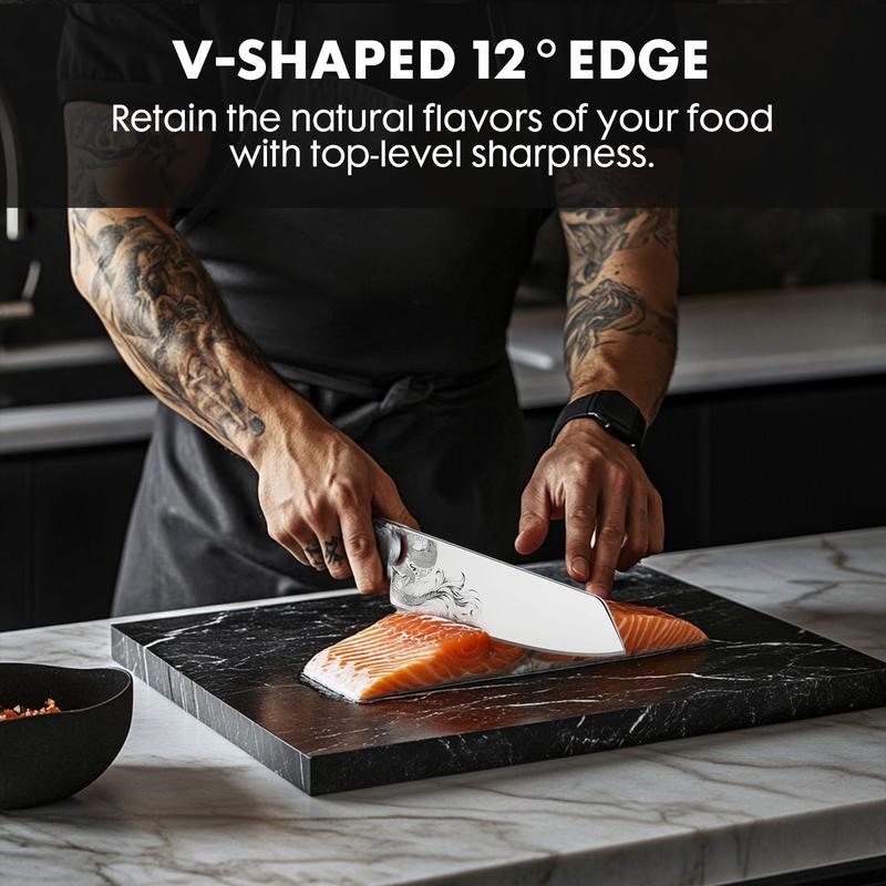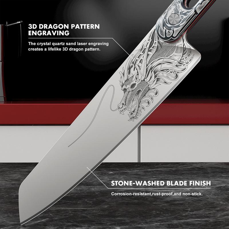 ·【Innovative Craftsmanship, Cutting-Edge Knives】The handle of the Purism Series Japanese chef knife features laser-engraved designs, and the knife body is laser engraved with crystal quartz sand, which gives the dragon pattern a realistic 3D effect, giving the product a unique artistic taste and visual appeal
