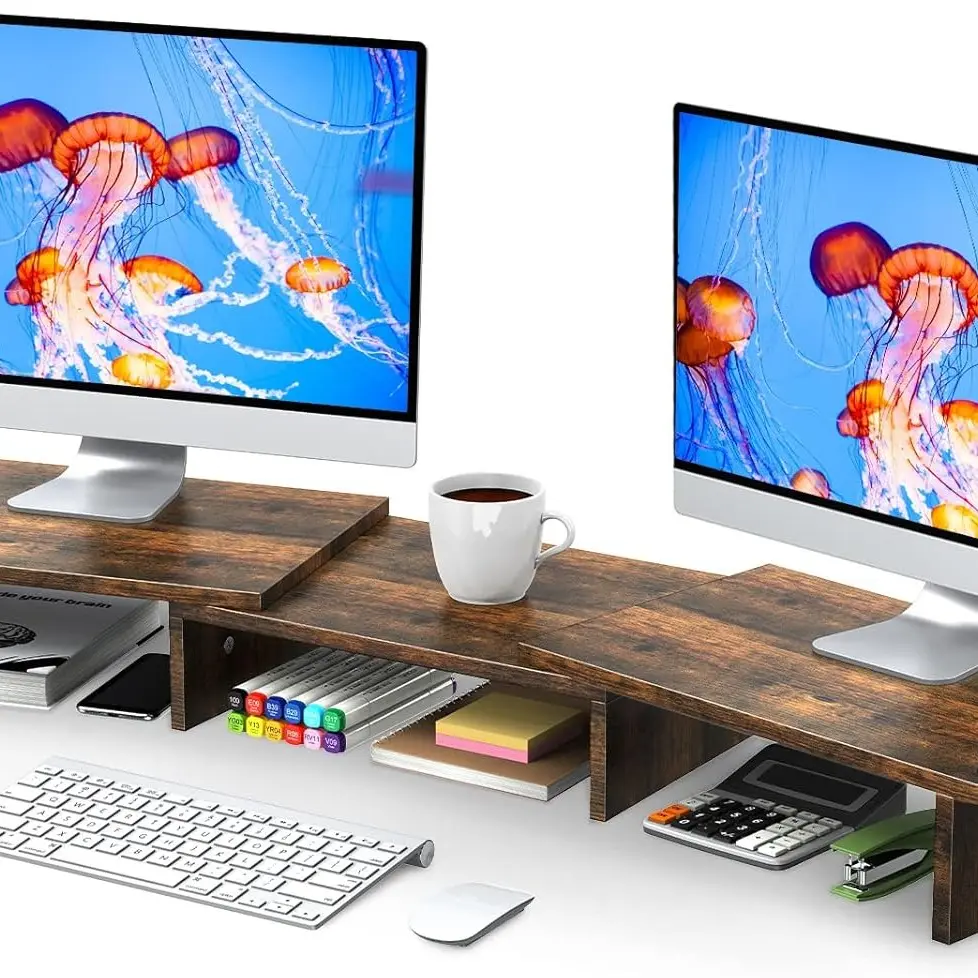 Wooden Dual Monitor Stand Riser with Adjustable Length and Angle for Desk Storage Space Rust Brown Ergonomic Home Office