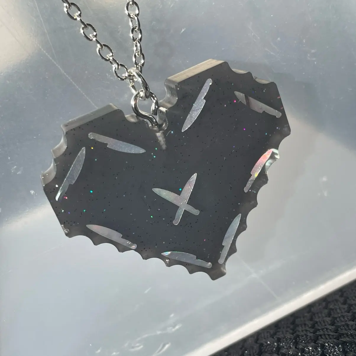 This heart necklace is a unique and edgy piece of jewelry that features knives as its design. The necklace is made of heart-shaped pendants that are adorned with knives, adding a touch of danger and edge to the overall look. The heart necklace is a great way to show your love for the edgy and bold, while also adding a touch of personality to your outfit.
