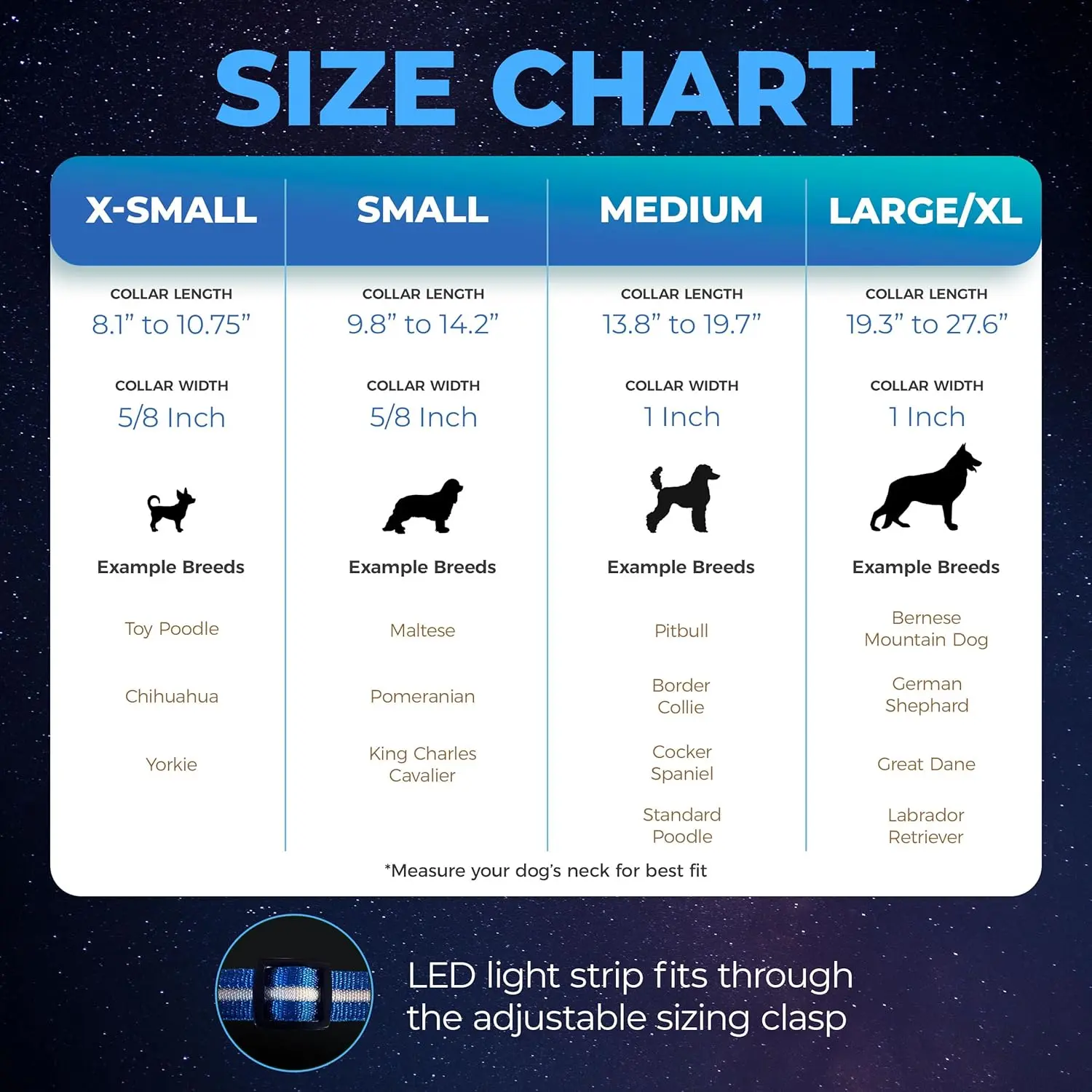 ·Pawesome Variety - Pick Your Style! From tiny tail-waggers to big barkers, we've got the perfect Blazin dog glow collar for every breed and personality. Choose your dog light up collar from 10 vibrant colors and 4 sizes (X-Small, Small, Medium or Large) - just check the size chart to find your fur-baby's match!