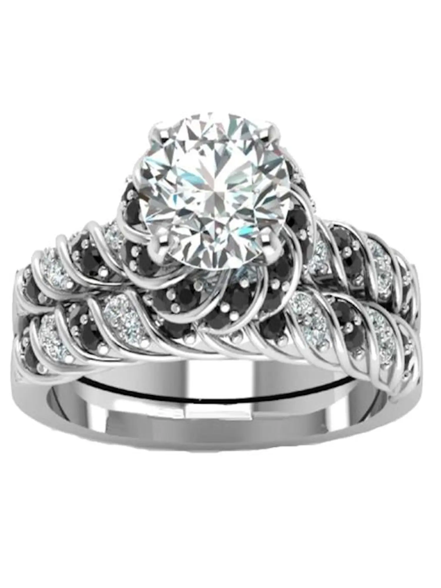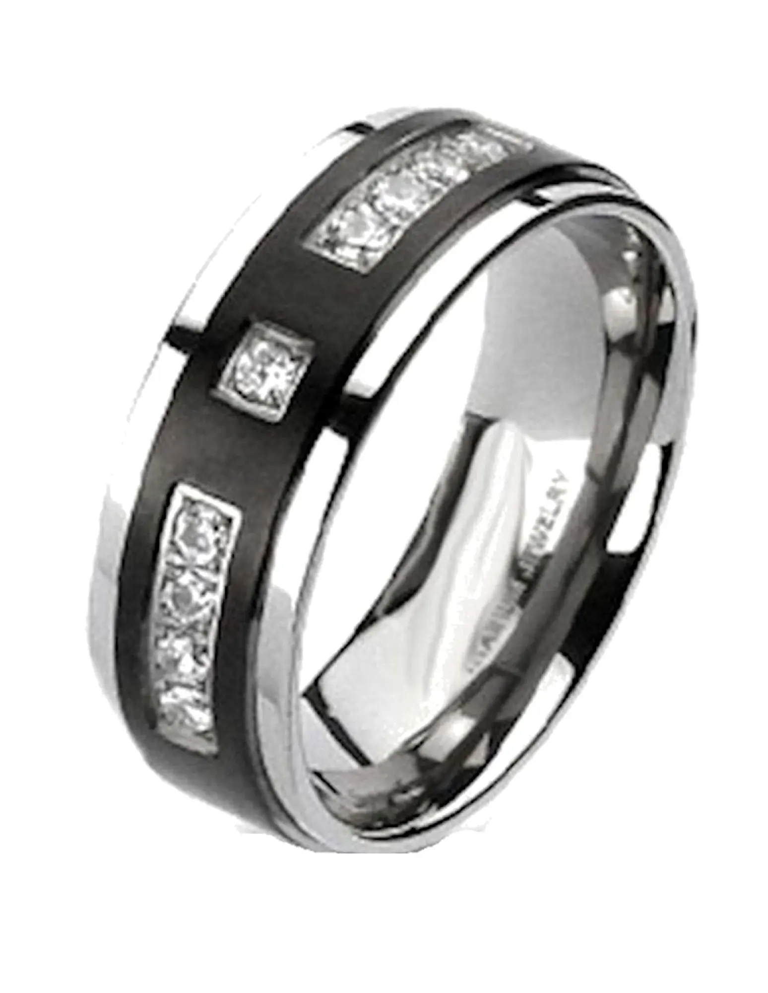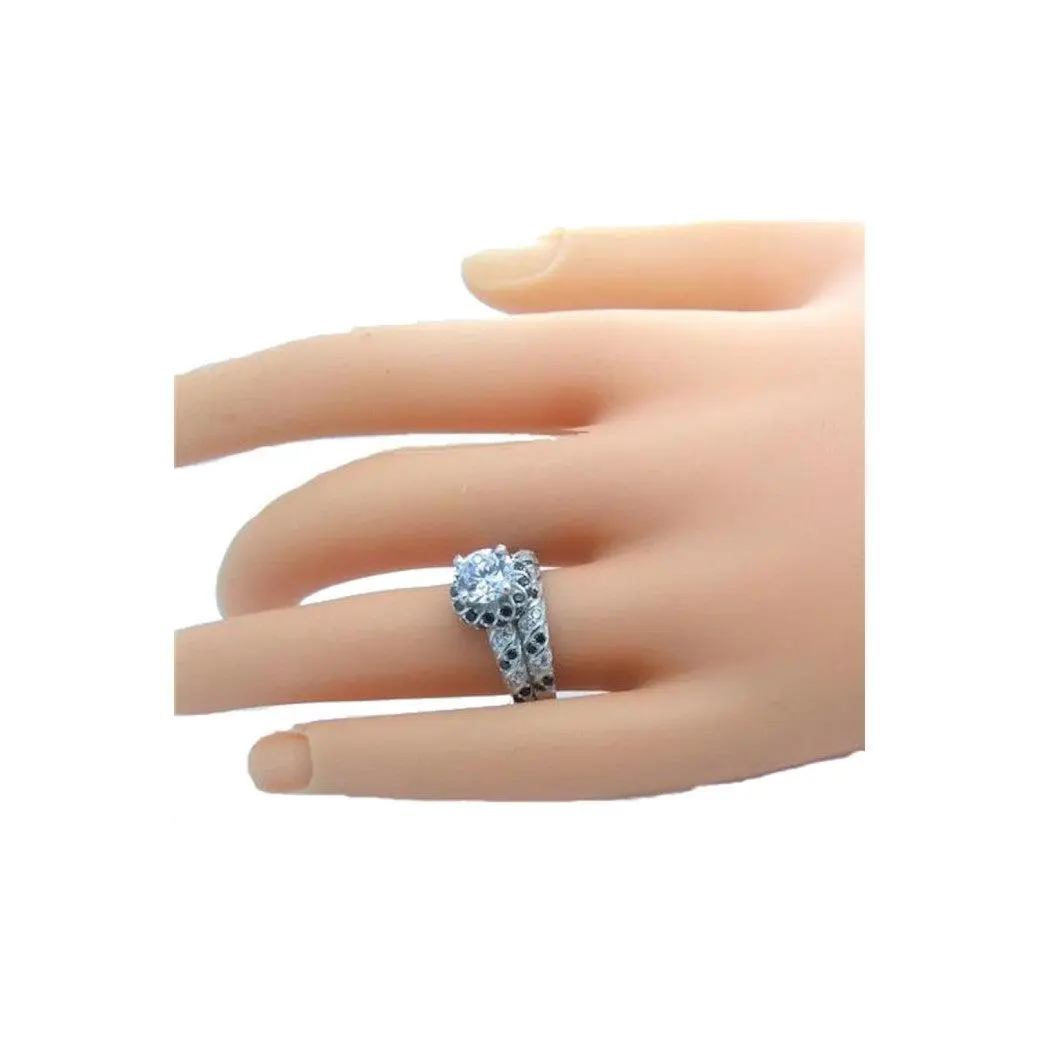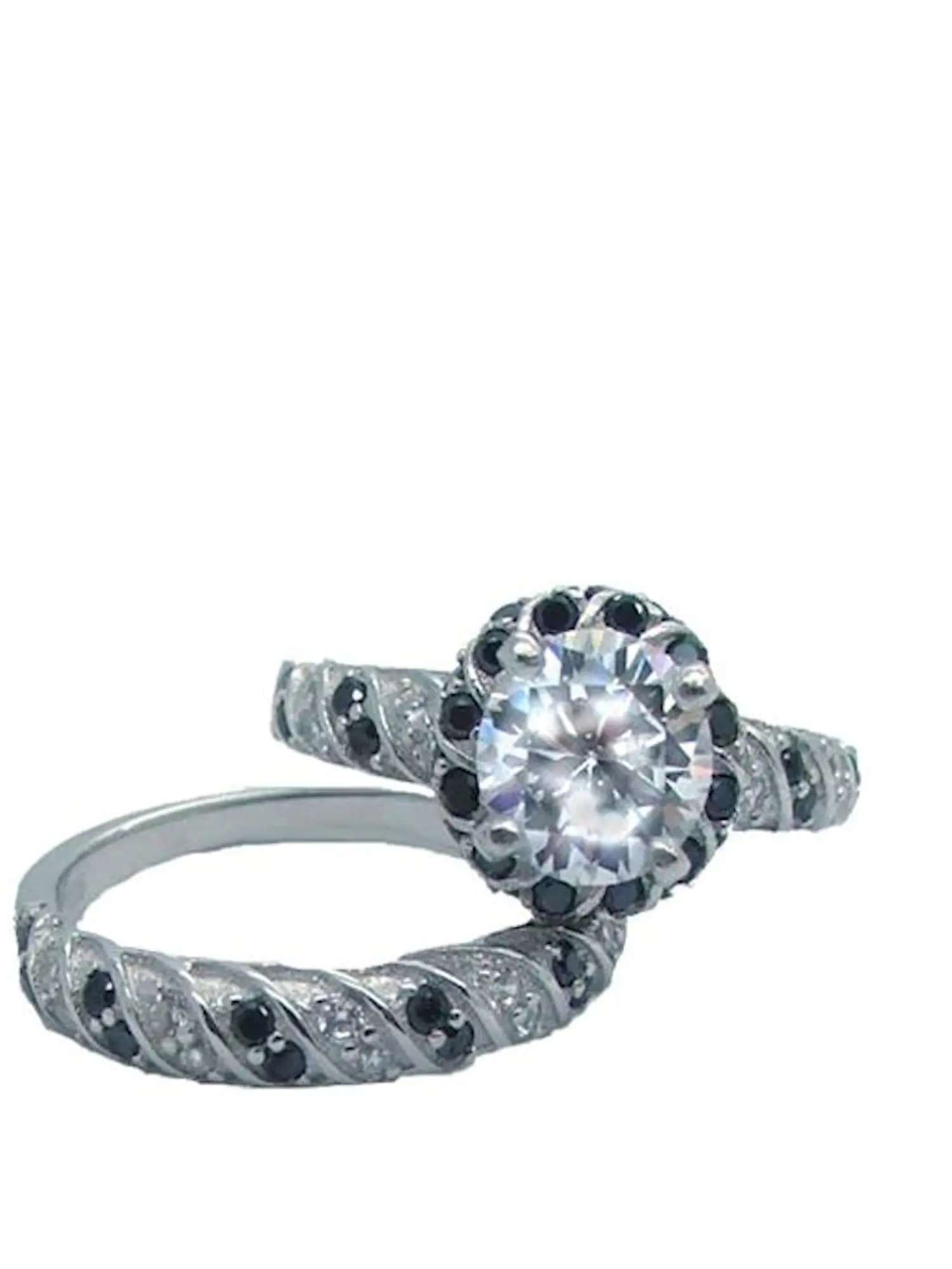 Women's ring set features a 7mm round cut solitaire cz stone (simulated lab-created) with alternating black and clear cz stones to create a halo effect. Alternating pave' black and clear stones on either side of the band with a matching wedding band. Each ring is 3mm wide. The men's ring is solid titanium with black plating and cz stones. 7mm wide. Gorgeous wedding ring set.