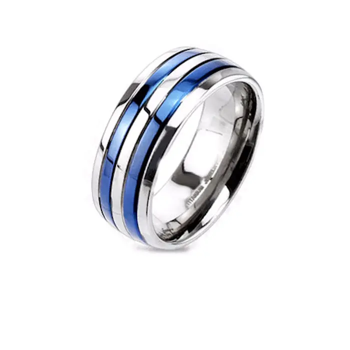 The man's ring is a solid titanium wedding band with blue ion plating. It's 8mm wide, designed for active men. Available in sizes 8-13, the set also includes women's sizes 5-10. Select your size from the drop-down menu.