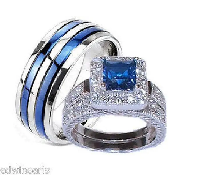 His & Hers Sapphire Blue & Clear Cz Wedding Ring Set