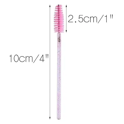 There are 50 crystal eyelash brushes in a bag, the mascara brush is about 4 inches (10 cm) long and the brush head is about 1 inch (2.5 cm). Small and portable, eye lash brush could easily fit in a makeup bag and be used on a variety of occasions.